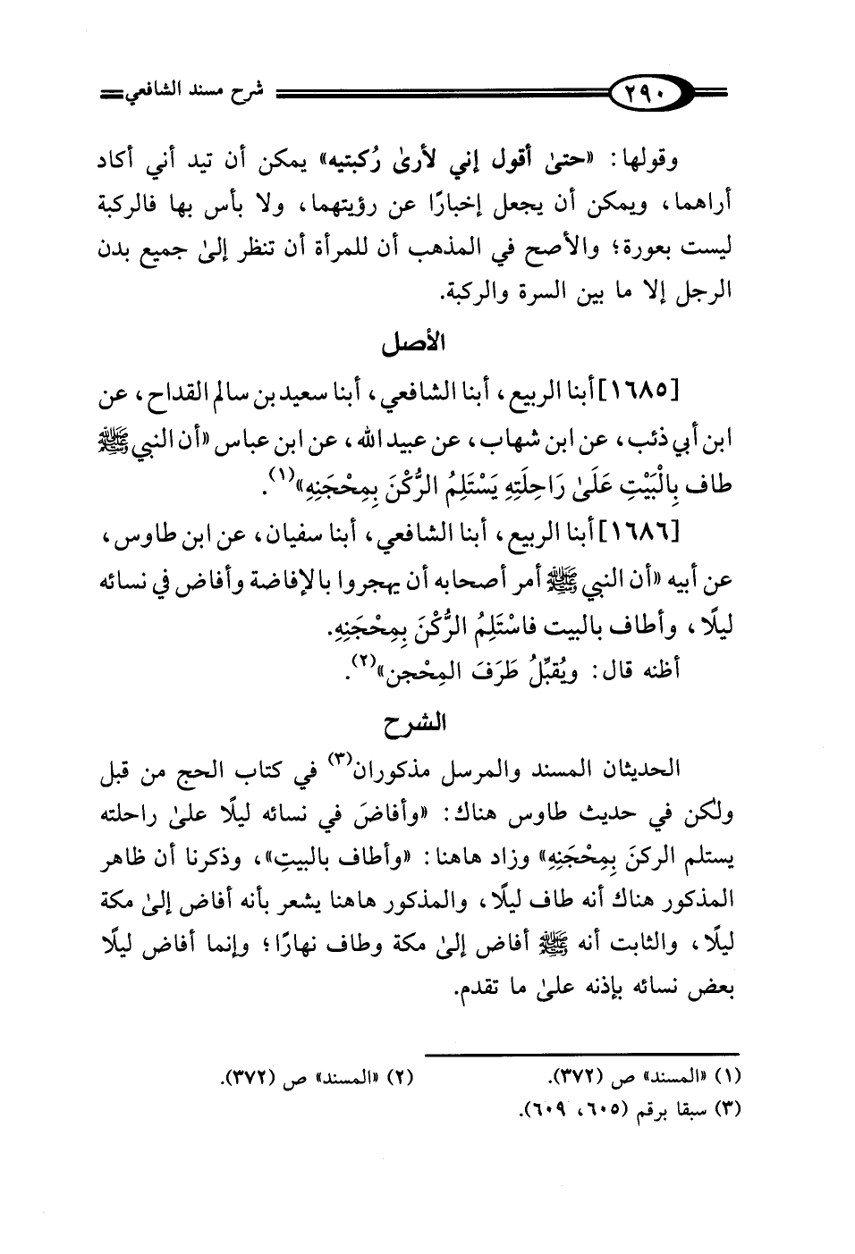 [1685] أبنا الربيع، أبنا الشافعي، أبنا سعيد بن سالم القداح، عن ابن أبي ذئب، عن ابن شهاب، عن عبيد الله، عن ابن عباس "أن النبي - صلى الله عليه وسلم - طاف بِالْبَيْتِ عَلَى رَاحِلَتِهِ يَسْتَلِمُ الرُّكْنَ بِمِحْجَنِهِ" (¬1).