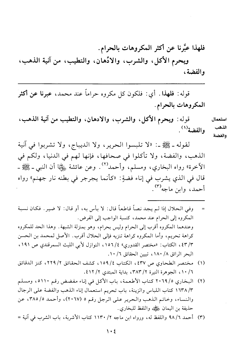 ويحرم الأكل، والشرب، والادِّهان، والتطيب، من آنية الذهب، والفضة،