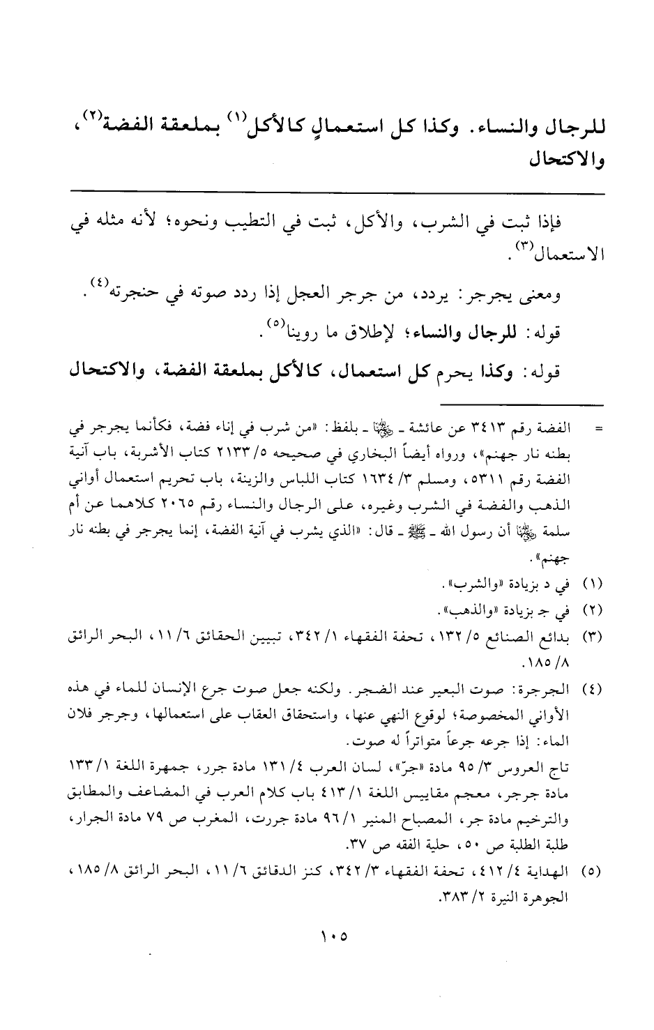 (¬٤) الجرجرة: صوت البعير عند الضجر. ولكنه جعل صوت جرع الإنسان للماء في هذه الأواني المخصوصة؛ لوقوع النهي عنها، واستحقاق العقاب على استعمالها، وجرجر فلان الماء: إذا جرعه جرعًا متواترًا له صوت.
