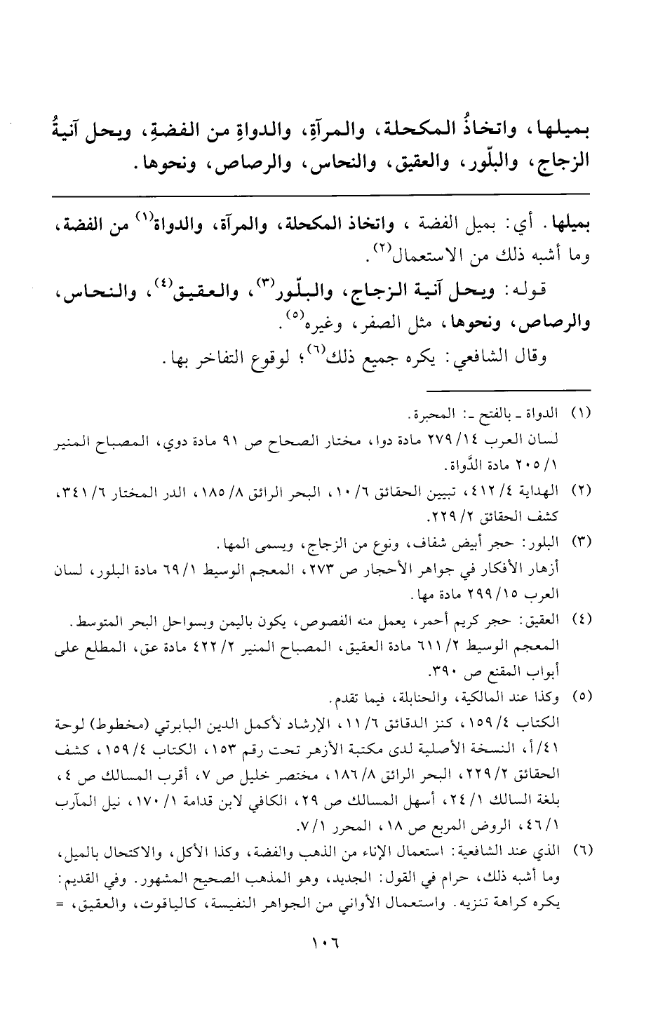 (¬٦) الذي عند الشافعية: استعمال الإناء من الذهب والفضة، وكذا الأكل، والاكتحال بالميل، وما أشبه ذلك، حرام في القول: الجديد، وهو المذهب الصحيح المشهور. وفي القديم: يكره كراهة تنزيه. واستعمال الأواني من الجواهر النفيسة، كالياقوت، والعقيق، =