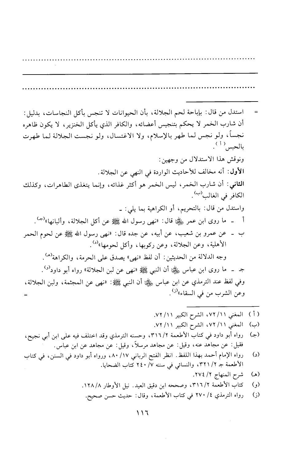 جـ - ما روى ابن عباس -رضي الله عنهما- أن النبي -صلى الله عليه وسلم- "نهى عن لبن الجلالة" رواه أبو داود (و).