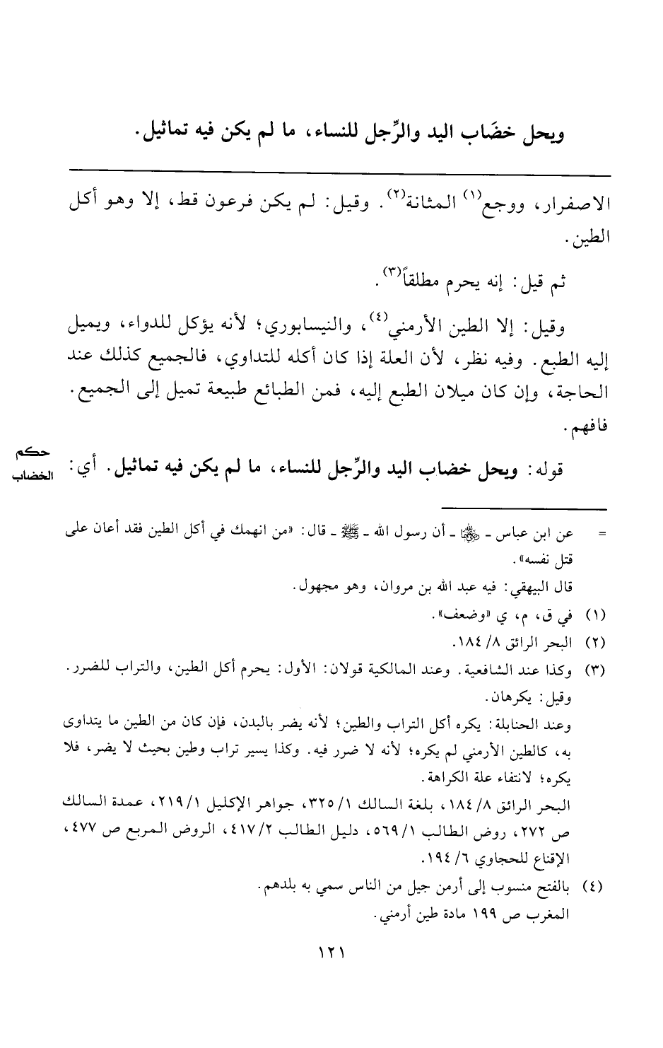 وقيل: إلا الطين الأرمني (¬٤)، والنيسابوري؛ لأنه يؤكل للدواء، ويميل إليه الطبع. وفيه نظر، لأن العلة إذا كان أكله للتداوي، فالجميع كذلك عند الحاجة، وإن كان ميلان الطبع إليه، فمن الطبائع طبيعة تميل إلى الجميع. فافهم.