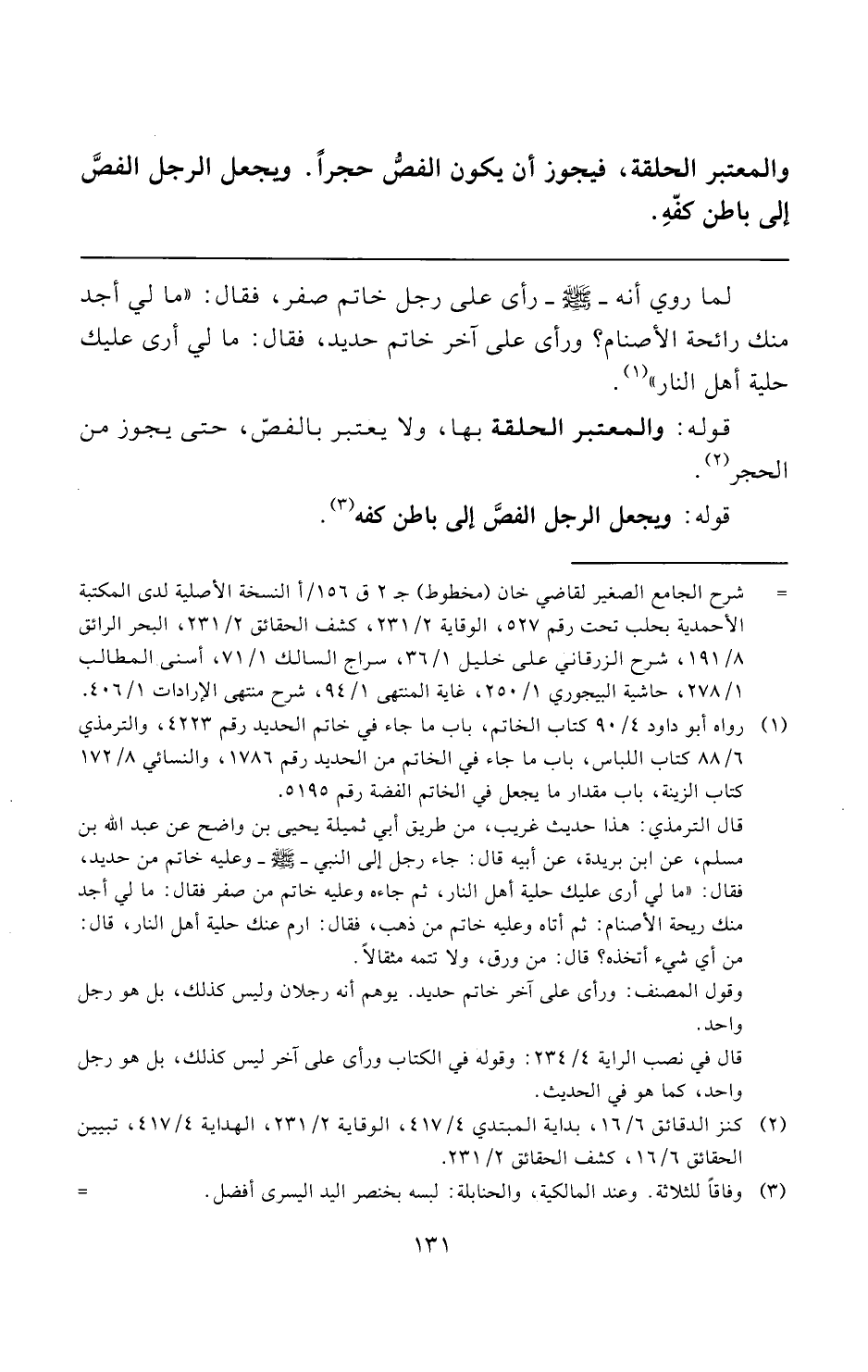 (¬١) رواه أبو داود ٤/ ٩٠ كتاب الخاتم، باب ما جاء في خاتم الحديد رقم ٤٢٢٣، والترمذي ٦/ ٨٨ كتاب اللباس، باب ما جاء في الخاتم من الحديد رقم ١٧٨٦، والنسائي ٨/ ١٧٢ كتاب الزينة، باب مقدار ما يجعل في الخاتم الفضة رقم ٥١٩٥.
