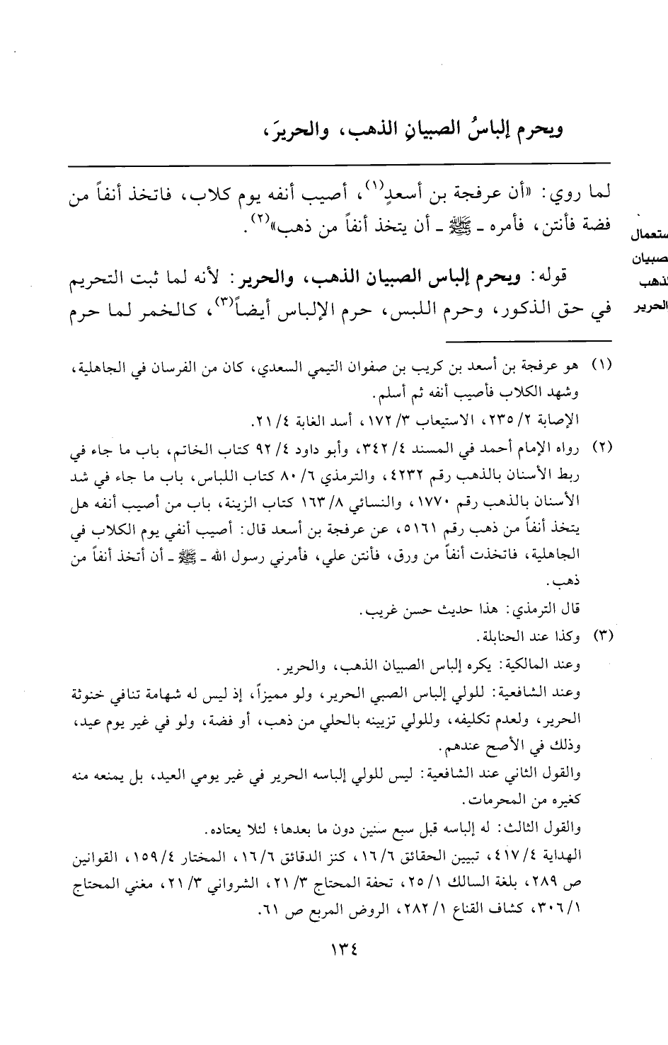 (¬٢) رواه الإمام أحمد في المسند ٤/ ٣٤٢، وأبو داود ٤/ ٩٢ كتاب الخاتم، باب ما جاء في ربط الأسنان بالذهب رقم ٤٢٣٢، والترمذي ٦/ ٨٠ كتاب اللباس، باب ما جاء في شد الأسنان بالذهب رقم ١٧٧٠، والنسائي ٨/ ١٦٣ كتاب الزينة، باب من أصيب أنفه هل يتخذ أنفًا من ذهب رقم ٥١٦١، عن عرفجة بن أسعد قال: أصيب أنفي يوم الكلاب في الجاهلية، فاتخذت أنفًا من ورق، فأنتن علي، فأمرني رسول الله -صلى الله عليه وسلم- أن أتخذ أنفًا من ذهب.