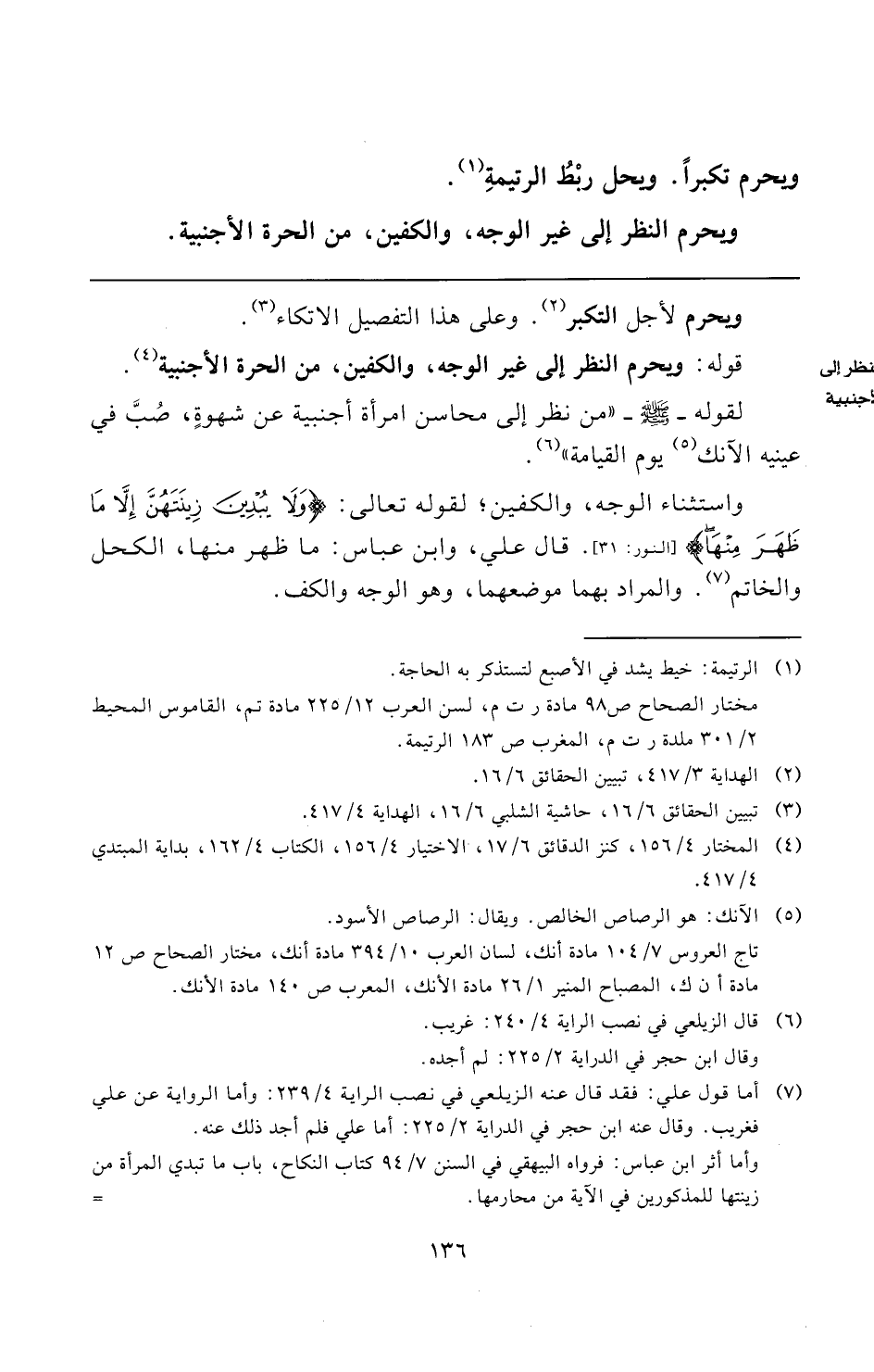 واستثناء الوجه، والكفين؛ لقوله تعالى: {وَلَا يُبْدِينَ زِينَتَهُنَّ إِلَّا مَا ظَهَرَ مِنْهَا} [النور: ٣١]. قال علي، وابن عباس: ما ظهر منها، الكحل والخاتم (¬٧). والمراد بهما موضعهما، وهو الوجه والكف.
