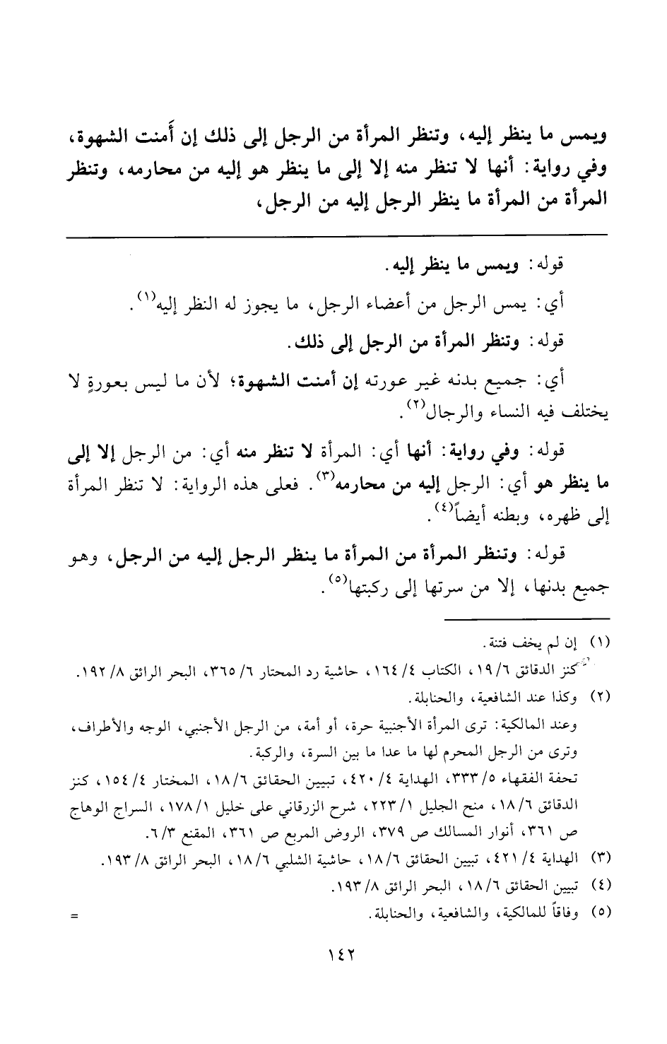 ويمس ما ينظر إليه، وتنظر المرأة من الرجل إلى ذلك إن أَمنت الشهوة، وفي رواية: أنها لا تنظر منه إلا إلى ما ينظر هو إليه من محارمه، وتنظر المرأة من المرأة ما ينظر الرجل إليه من الرجل،