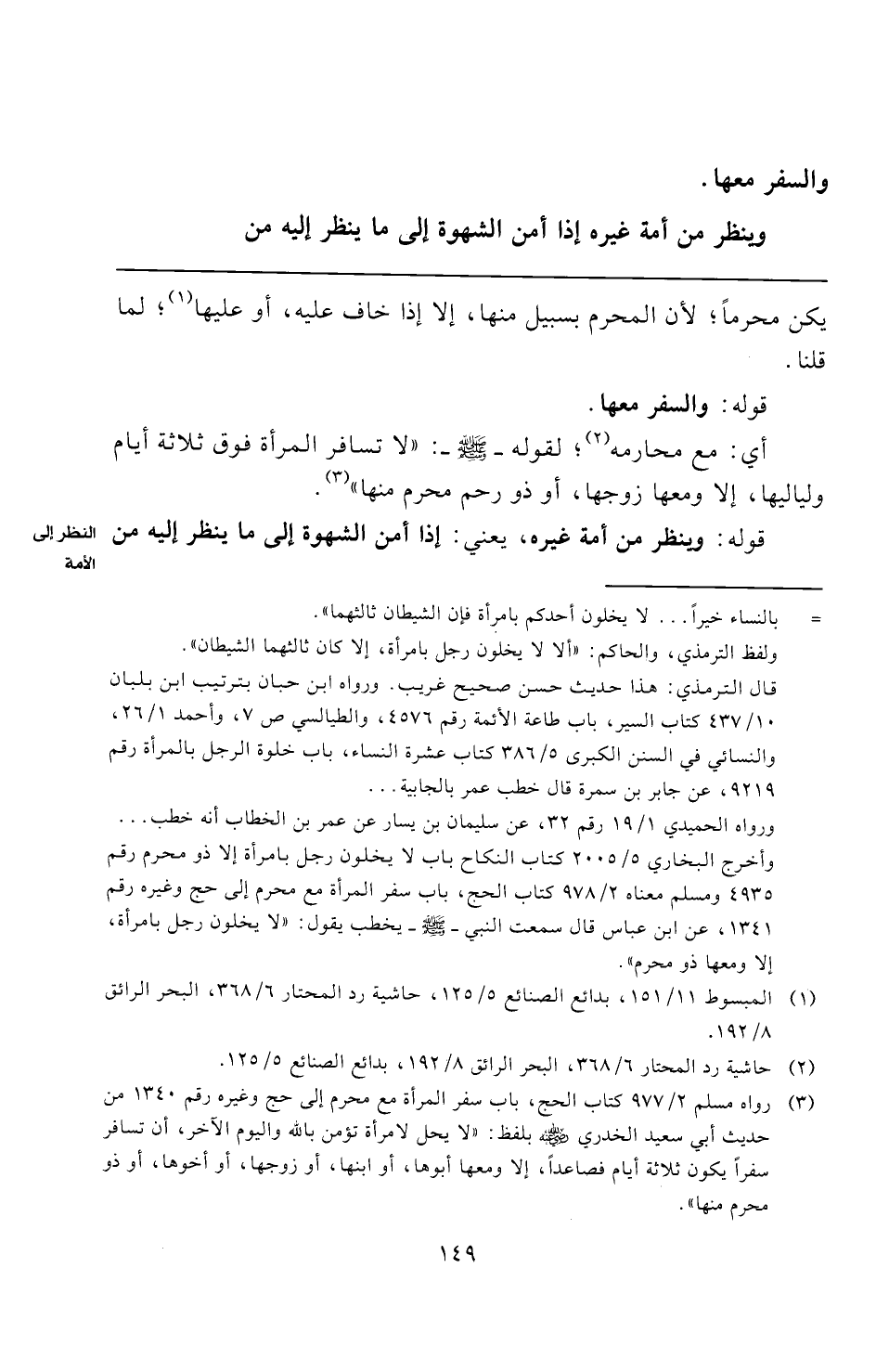 (¬٣) رواه مسلم ٢/ ٩٧٧ كتاب الحج، باب سفر المرأة مع محرم إلى حج وغيره رقم ١٣٤٠ من حديث أبي سعيد الخدري -رضي الله عنه- بلفظ: "لا يحل لامرأة تؤمن بالله واليوم الآخر، أن تسافر سفرًا يكون ثلاثة أيام فصاعدًا، إلا ومعها أبوها، أو ابنها، أو زوجها، أو أخوها، أو ذو محرم منها".