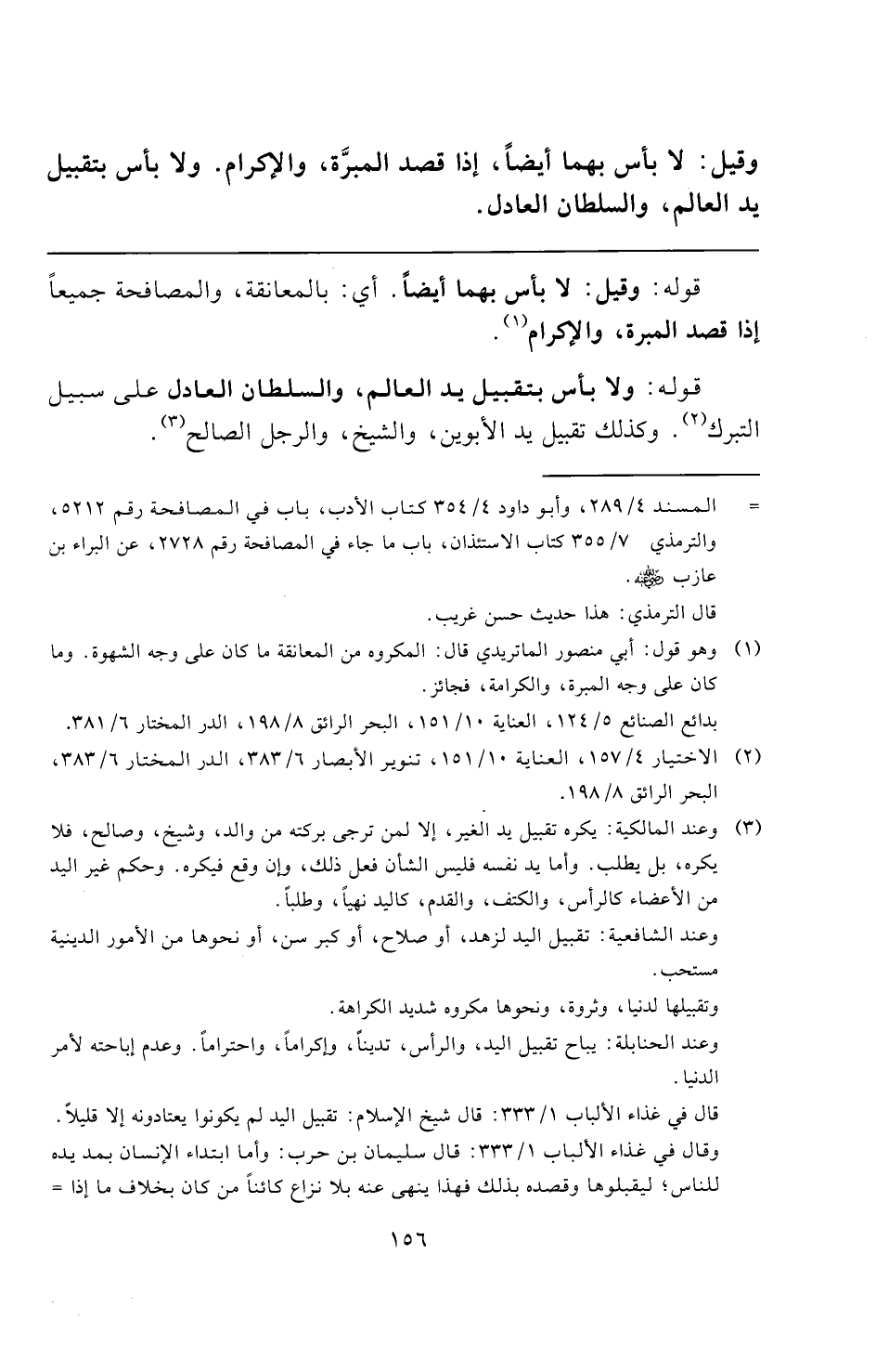 قوله: ولا بأس بتقبيل يد العالم، والسلطان العادل على سبيل التبرك (¬٢). وكذلك تقبيل يد الأبوين، والشيخ، والرجل الصالح (¬٣).