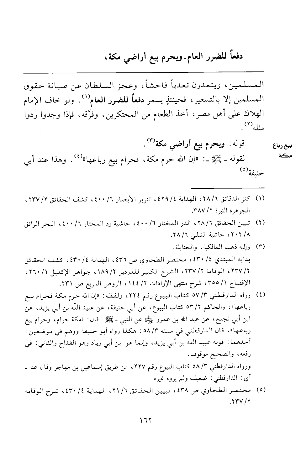 (¬٤) رواه الدارقطني ٣/ ٥٧ كتاب البيوع رقم ٢٢٤، ولفظه: "إن الله حرم مكة فحرام بيع رباعها"، والحاكم ٢/ ٥٣ كتاب البيوع، عن أبي حنيفة، عن عبيد الله بن أبي يزيد، عن ابن أبي نجيح، عن عبد الله بن عمرو -رضي الله عنهما- عن النبي -صلى الله عليه وسلم- قال: "مكة حرام، وحرام بيع رباعها"، قال الدارقطني في سننه ٣/ ٥٨: هكذا رواه أبو حنيفة ووهم في موضعين: أحدهما: قوله عبيد الله بن أبي يزيد، وإنما هو ابن أبي زياد وهو القداح والثاني: في رفعه، والصحيح موقوف.