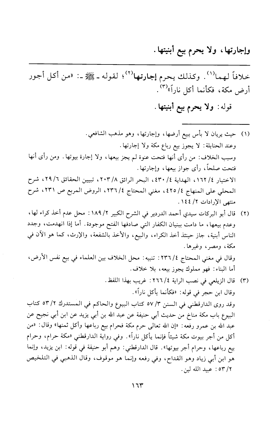 (¬٢) قال أبو البركات سيدي أحمد الدردير في الشرح الكبير ٢/ ١٨٩: محل عدم أخذ كراء لها، وعدم بيعها، ما دامت ببنيان الكفار التي صادفها الفتح موجودة. أما إذا انهدمت، وجدد الناس أبنية، جاز حينئذ أخذ الكراء، والبيع، والأخذ بالشفعة، والإرث، كما هو الآن في مكة، ومصر، وغيرها.