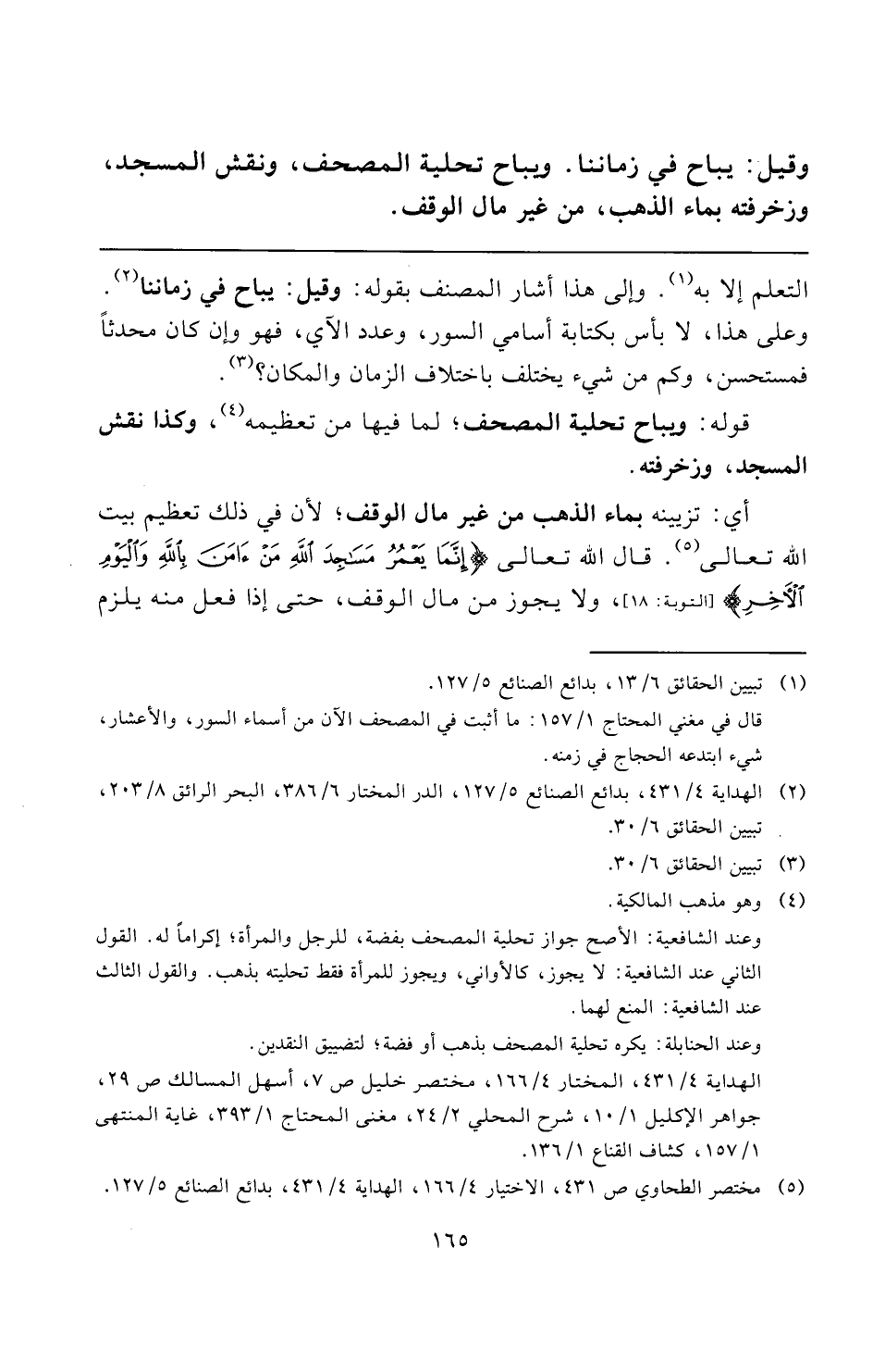 وقيل: يباح في زماننا. ويباح تحلية المصحف، ونقش المسجد، وزخرفته بماء الذهب، من غير مال الوقف.
