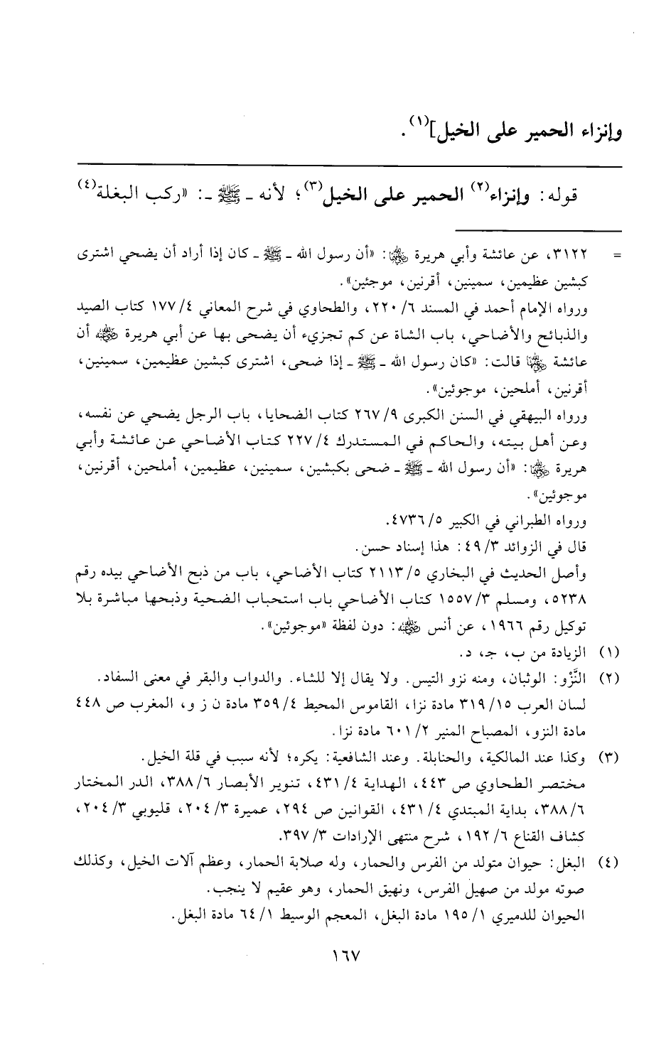 (¬٤) البغل: حيوان متولد من الفرس والحمار، وله صلابة الحمار، وعظم آلات الخيل، وكذلك صوته مولد من صهيل الفرس، ونهيق الحمار، وهو عقيم لا ينجب.
