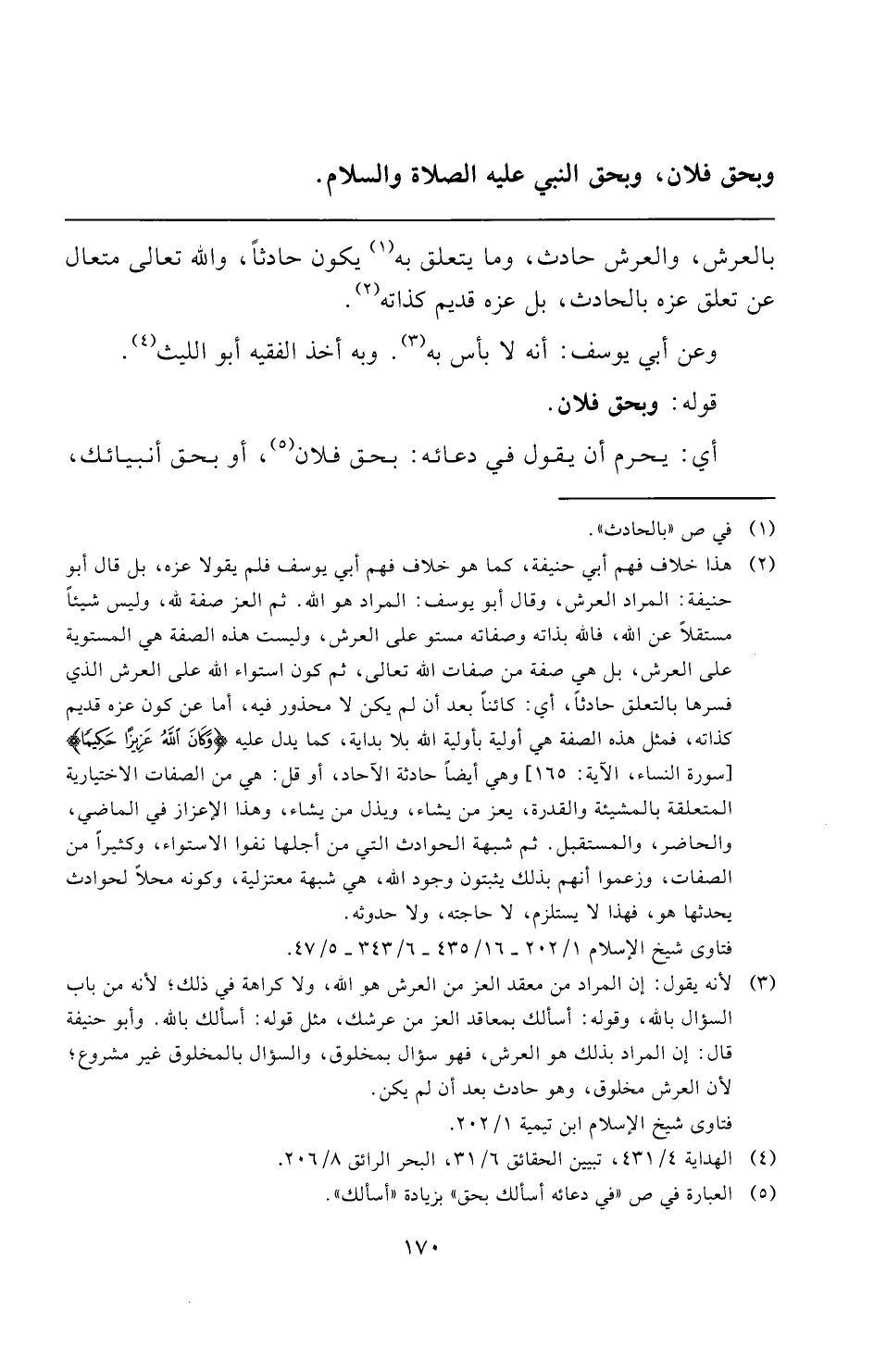 (¬٣) لأنه يقول: إن المراد من معقد العز من العرش هو الله، ولا كراهة في ذلك؛ لأنه من باب السؤال بالله، وقوله: أسألك بمعاقد العز من عرشك، مثل قوله: أسألك بالله. وأبو حنيفة قال: إن المراد بذلك هو العرش، فهو سؤال بمخلوق، والسؤال بالمخلوق غير مشروع؛ لأن العرش مخلوق، وهو حادث بعد أن لم يكن.