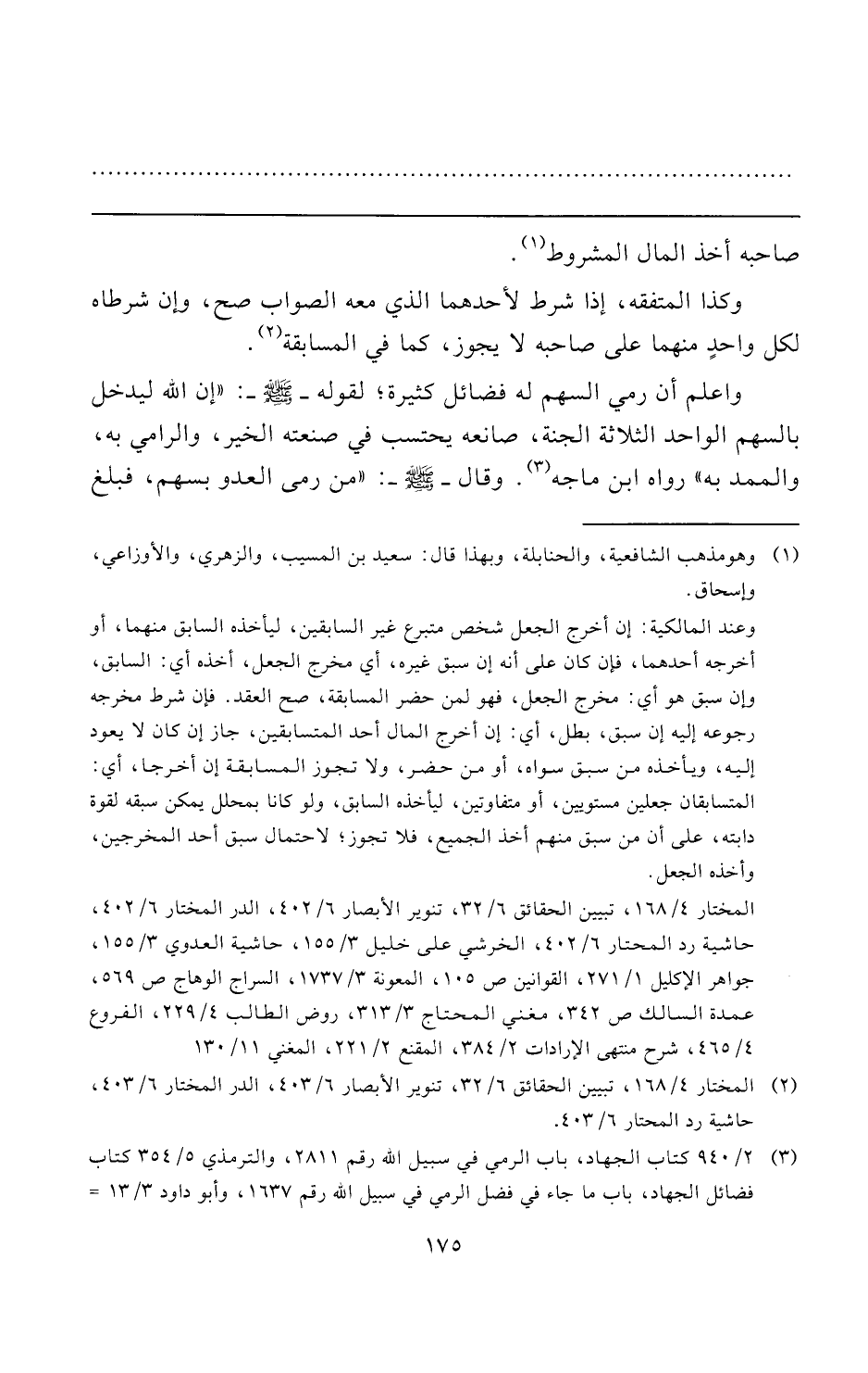 (¬١) وهو مذهب الشافعية، والحنابلة، وبهذا قال: سعيد بن المسيب، والزهري، والأوزاعي، وإسحاق. وعند المالكية: إن أخرج الجعل شخص متبرع غير السابقين، ليأخذه السابق منهما، أو أخرجه أحدهما، فإن كان على أنه إن سبق غيره، أي مخرج الجعل، أخذه أي: السابق، وإن سبق هو أي: مخرج الجعل، فهو لمن حضر المسابقة، صح العقد. فإن شرط مخرجه رجوعه إليه إن سبق، بطل، أي: إن أخرج المال أحد المتسابقين، جاز إن كان لا يعود إليه، ويأخذه من سبق سواه، أو من حضر، ولا تجوز المسابقة إن أخرجا، أي: المتسابقان جعلين مستويين، أو متفاوتين، ليأخذه السابق، ولو كانا بمحلل يمكن سبقه لقوة دابته، على أن من سبق منهم أخذ الجميع، فلا تجوز؛ لاحتمال سبق أحد المخرجين، وأخذه الجعل.