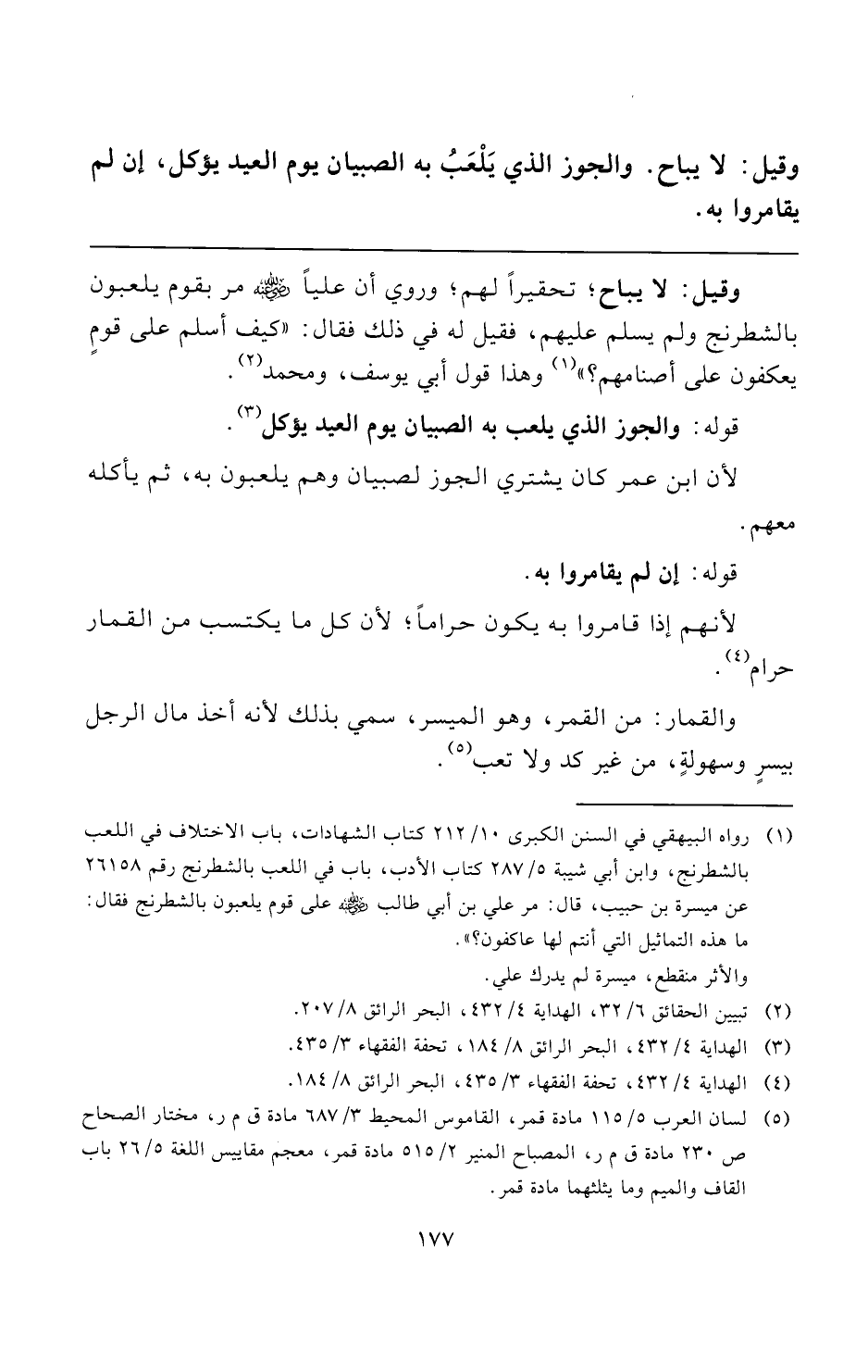 وقيل: لا يباح. والجوز الذي يَلْعَبُ به الصبيان يوم العيد يؤكل، إن لم يقامروا به.