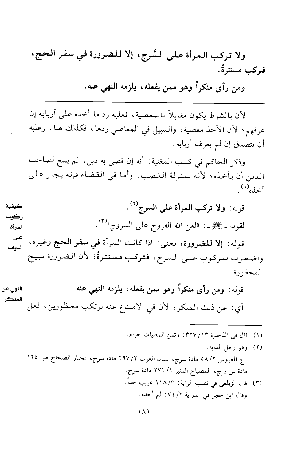 ولا تركب المرأة على السَّرج، إلا للضرورة في سفر الحج، فتركب مستترةً.