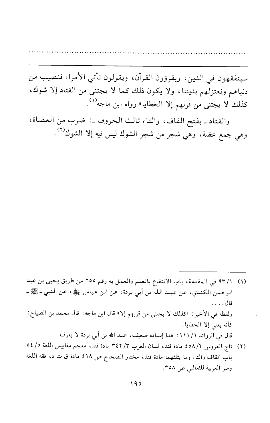 (¬٢) تاج العروس ٢/ ٤٥٨ مادة قتد، لسان العرب ٣/ ٣٤٢ مادة قتد، معجم مقاييس اللغة ٥/ ٥٤ باب القاف والتاء وما يثلثهما مادة قتد، مختار الصحاح ص ٤١٨ مادة ق ت د، فقه اللغة وسر العربية للثعالبي ص ٣٥٨.