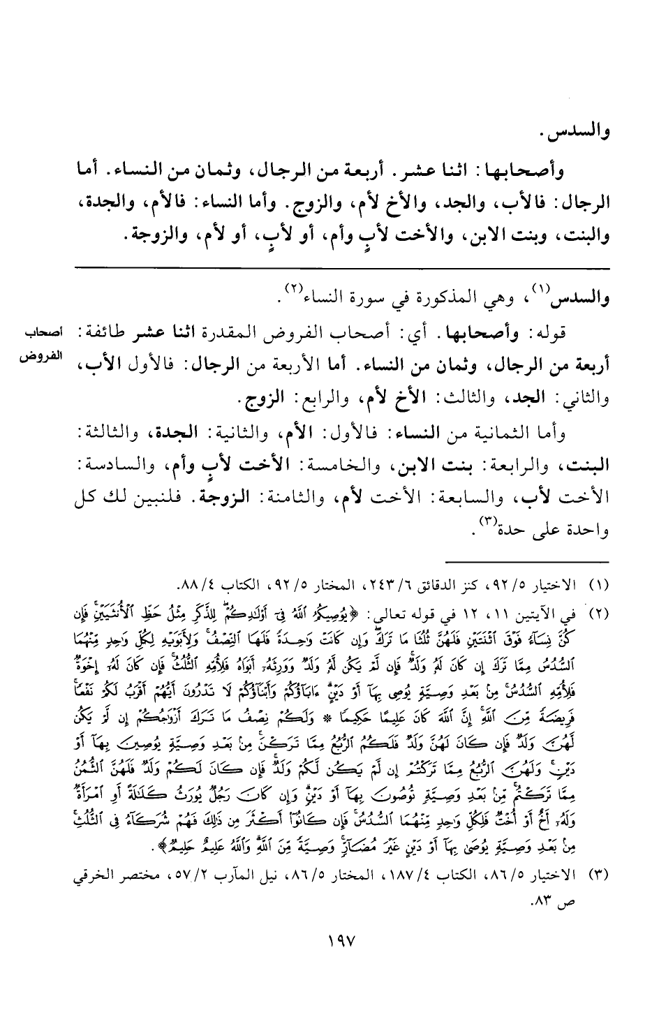 (¬٢) في الآيتين ١١، ١٢ في قوله تعالى: {يُوصِيكُمُ اللَّهُ فِي أَوْلَادِكُمْ لِلذَّكَرِ مِثْلُ حَظِّ الْأُنْثَيَيْنِ فَإِنْ كُنَّ نِسَاءً فَوْقَ اثْنَتَيْنِ فَلَهُنَّ ثُلُثَا مَا تَرَكَ وَإِنْ كَانَتْ وَاحِدَةً فَلَهَا النِّصْفُ وَلِأَبَوَيْهِ لِكُلِّ وَاحِدٍ مِنْهُمَا السُّدُسُ مِمَّا تَرَكَ إِنْ كَانَ لَهُ وَلَدٌ فَإِنْ لَمْ يَكُنْ لَهُ وَلَدٌ وَوَرِثَهُ أَبَوَاهُ فَلِأُمِّهِ الثُّلُثُ فَإِنْ كَانَ لَهُ إِخْوَةٌ فَلِأُمِّهِ السُّدُسُ مِنْ بَعْدِ وَصِيَّةٍ يُوصِي بِهَا أَوْ دَيْنٍ آبَاؤُكُمْ وَأَبْنَاؤُكُمْ لَا تَدْرُونَ أَيُّهُمْ أَقْرَبُ لَكُمْ نَفْعًا فَرِيضَةً مِنَ اللَّهِ إِنَّ اللَّهَ كَانَ عَلِيمًا حَكِيمًا (١١) وَلَكُمْ نِصْفُ مَا تَرَكَ أَزْوَاجُكُمْ إِنْ لَمْ يَكُنْ لَهُنَّ وَلَدٌ فَإِنْ كَانَ لَهُنَّ وَلَدٌ فَلَكُمُ الرُّبُعُ مِمَّا تَرَكْنَ مِنْ بَعْدِ وَصِيَّةٍ يُوصِينَ بِهَا أَوْ دَيْنٍ وَلَهُنَّ الرُّبُعُ مِمَّا تَرَكْتُمْ إِنْ لَمْ يَكُنْ لَكُمْ وَلَدٌ فَإِنْ كَانَ لَكُمْ وَلَدٌ فَلَهُنَّ الثُّمُنُ مِمَّا تَرَكْتُمْ مِنْ بَعْدِ وَصِيَّةٍ تُوصُونَ بِهَا أَوْ دَيْنٍ وَإِنْ كَانَ رَجُلٌ يُورَثُ كَلَالَةً أَوِ امْرَأَةٌ وَلَهُ أَخٌ أَوْ أُخْتٌ فَلِكُلِّ وَاحِدٍ مِنْهُمَا السُّدُسُ فَإِنْ كَانُوا أَكْثَرَ مِنْ ذَلِكَ فَهُمْ شُرَكَاءُ فِي الثُّلُثِ مِنْ بَعْدِ وَصِيَّةٍ يُوصَى بِهَا أَوْ دَيْنٍ غَيْرَ مُضَارٍّ وَصِيَّةً مِنَ اللَّهِ وَاللَّهُ عَلِيمٌ حَلِيمٌ}.