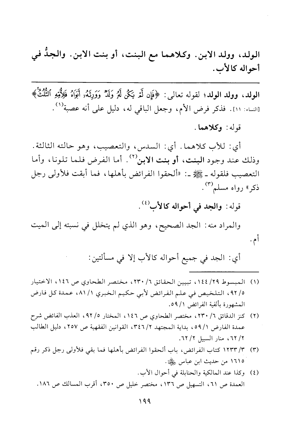 (¬١) المبسوط ٢٩/ ١٤٤، تبيين الحقائق ٦/ ٢٣٠، مختصر الطحاوي ص ١٤٦، الاختيار ٥/ ٩٢، التلخيص في علم الفرائض لأبي حكيم الخبري ١/ ٨١، عمدة كل فارض المشهورة بألفية الفرائض ١/ ٥٩.