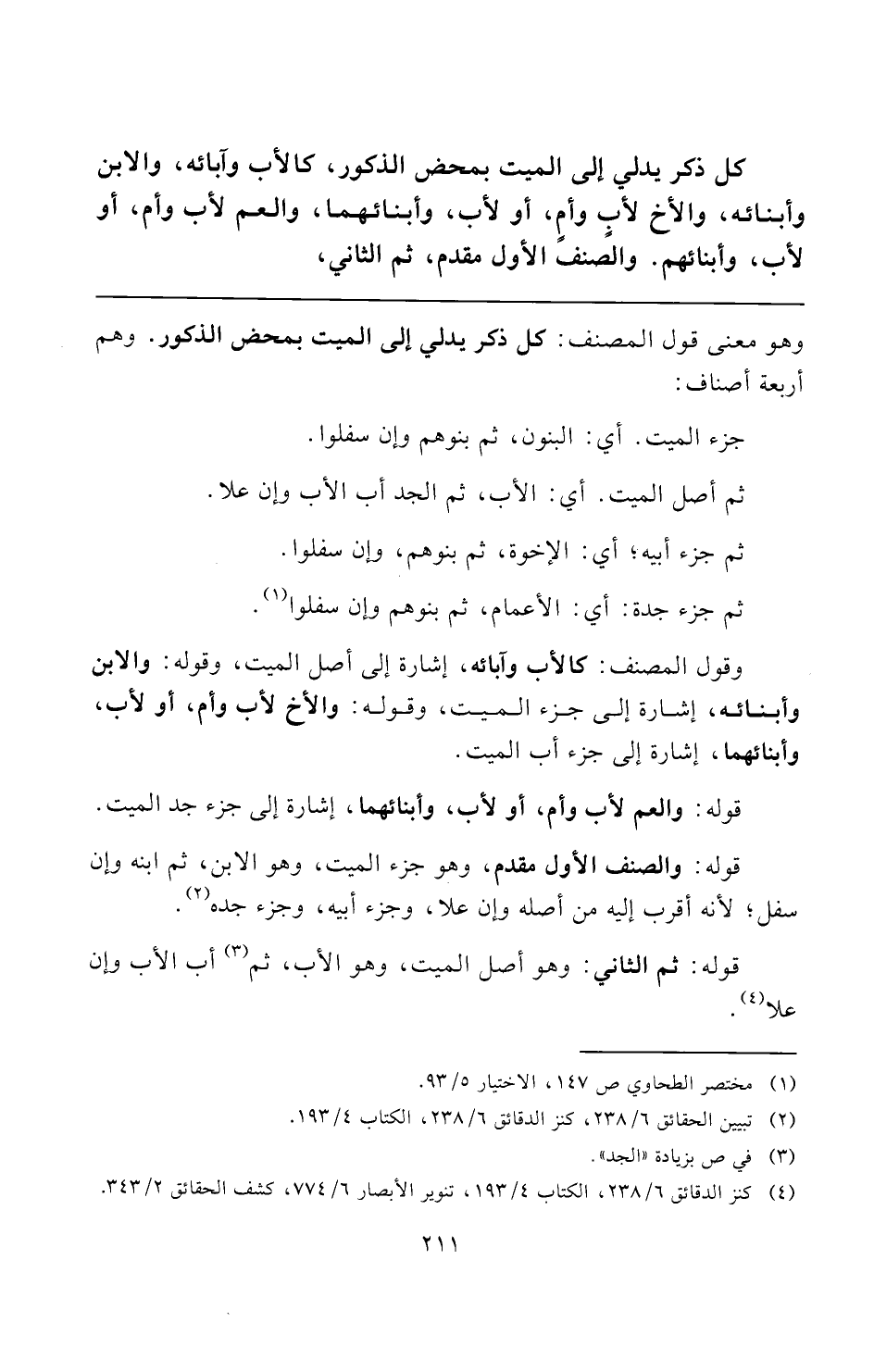 وهو معنى قول المصنف: كل ذكر يدلي إلى الميت بمحض الذكور. وهم أربعة أصناف: