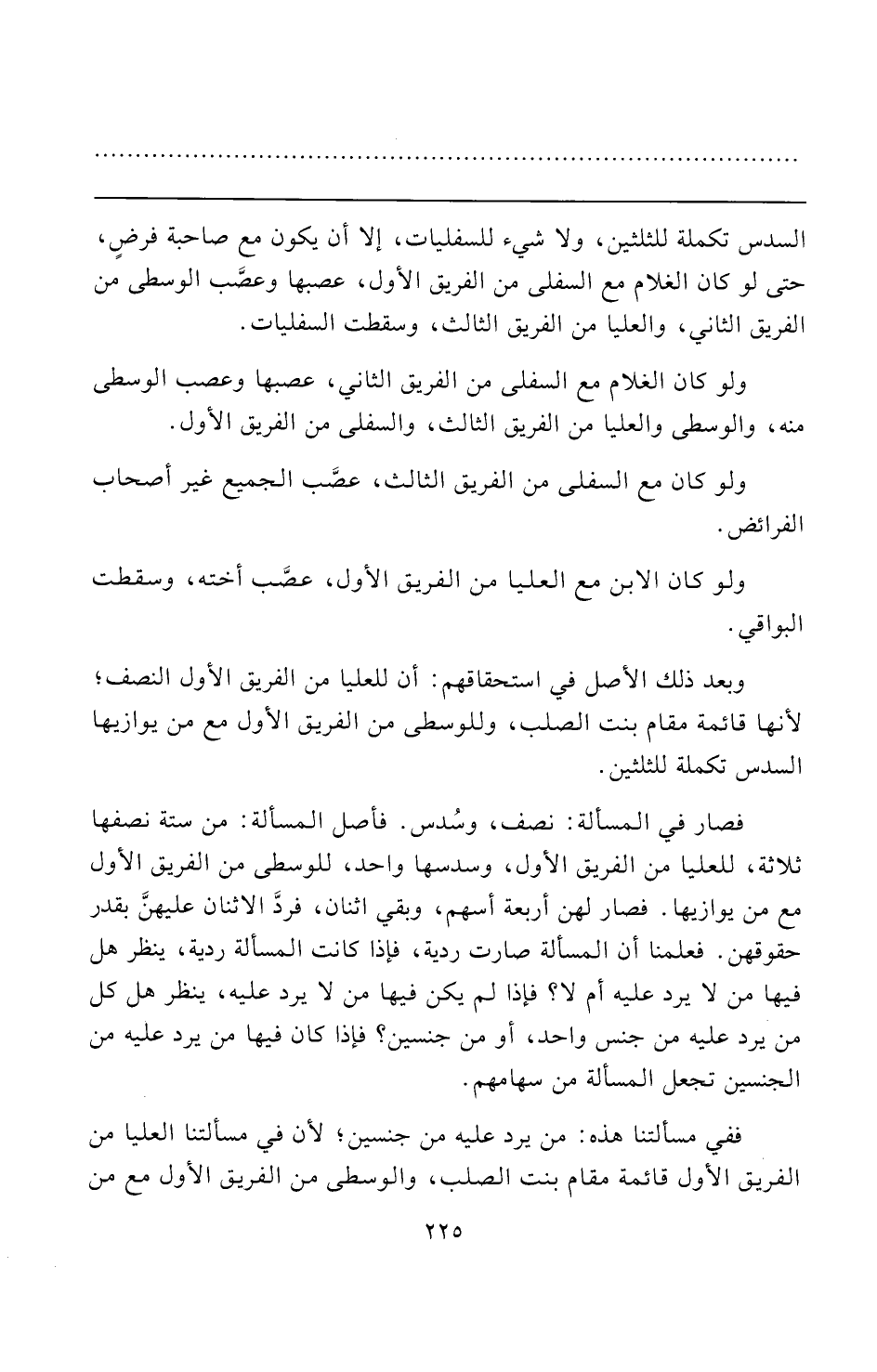 السدس تكملة للثلثين، ولا شيء للسفليات، إلا أن يكون مع صاحبة فرضٍ، حتى لو كان الغلام مع السفلى من الفريق الأول، عصبها وعصَّب الوسطى من الفريق الثاني، والعليا من الفريق الثالث، وسقطت السفليات.