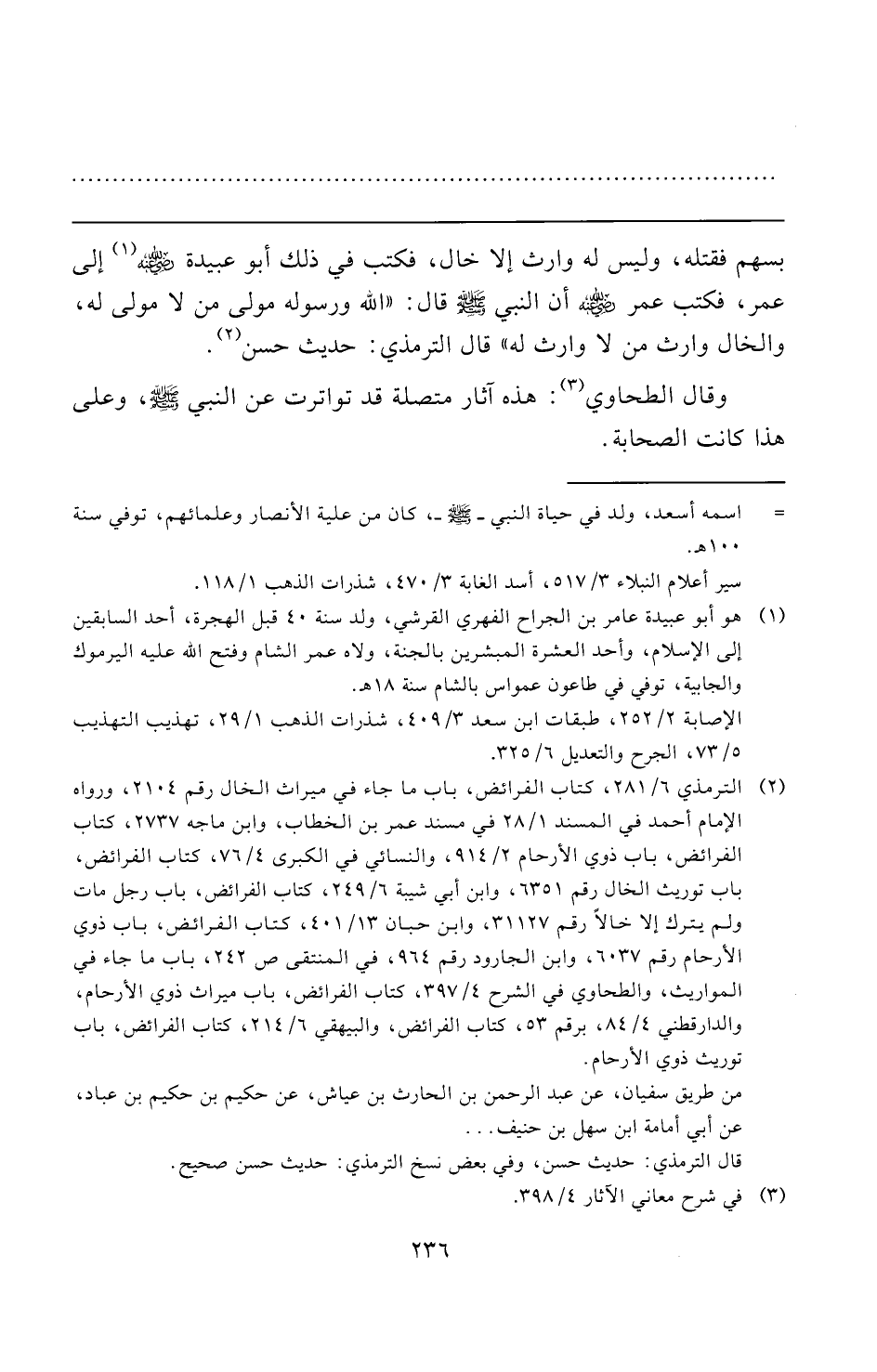 (¬٢) الترمذي ٦/ ٢٨١، كتاب الفرائض، باب ما جاء في ميراث الخال رقم ٢١٠٤، ورواه الإمام أحمد في المسند ١/ ٢٨ في مسند عمر بن الخطاب، وابن ماجه ٢٧٣٧، كتاب الفرائض، باب ذوي الأرحام ٢/ ٩١٤، والنسائي في الكبرى ٤/ ٧٦، كتاب الفرائض، باب توريث الخال رقم ٦٣٥١، وابن أبي شيبة ٦/ ٢٤٩، كتاب الفرائض، باب رجل مات ولم يترك إلا خالًا رقم ٣١١٢٧، وابن حبان ١٣/ ٤٠١، كتاب الفرائض، باب ذوي الأرحام رقم ٦٠٣٧، وابن الجارود رقم ٩٦٤، في المنتقى ص ٢٤٢، باب ما جاء في المواريث، والطحاوي في الشرح ٤/ ٣٩٧، كتاب الفرائض، باب ميراث ذوي الأرحام، والدارقطني ٤/ ٨٤، برقم ٥٣، كتاب الفرائض، والبيهقي ٦/ ٢١٤، كتاب الفرائض، باب توريث ذوي الأرحام.