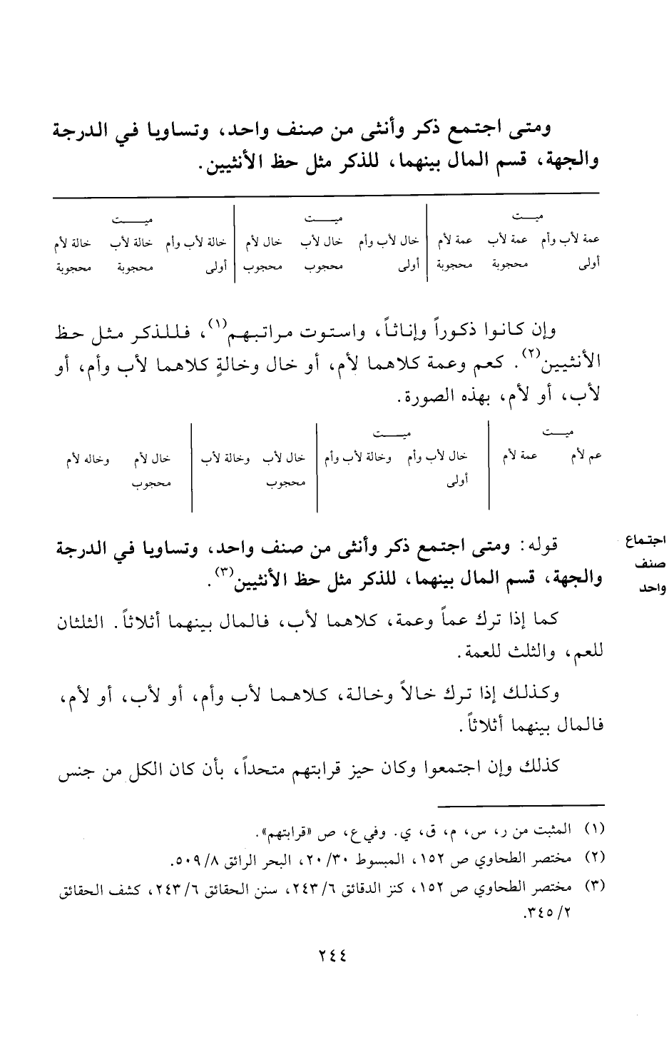 قوله: ومتى اجتمع ذكر وأنثى من صنف واحد، وتساويا في الدرجة والجهة، قسم المال بينهما، للذكر مثل حظ الأنثيين (¬٣).