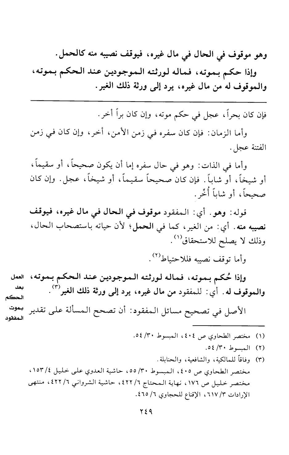 قوله: وهو. أي: المفقود موقوف في الحال في مال غيره، فيوقف نصيبه منه. أي: من الغير، كما فى الحمل؛ لأن حياته باستصحاب الحال، وذلك لا يصلح للاستحقاق (¬١).