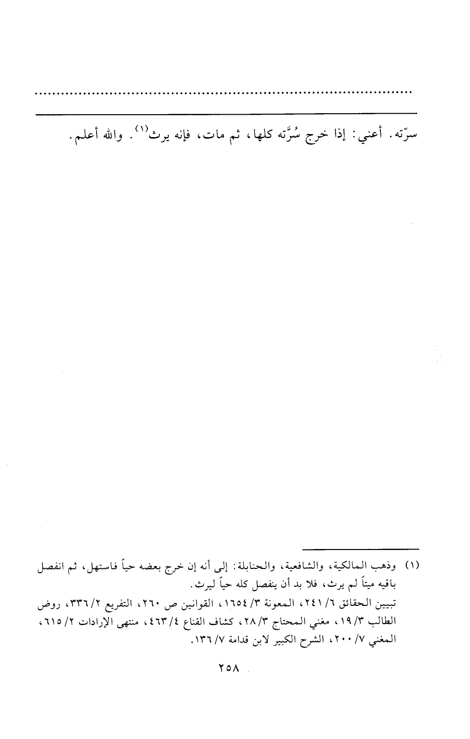 (¬١) وذهب المالكية، والشافعية، والحنابلة: إلى أنه إن خرج بعضه حيًا فاستهل، ثم انفصل باقيه ميتًا لم يرث، فلا بد أن ينفصل كله حيًا ليرث.