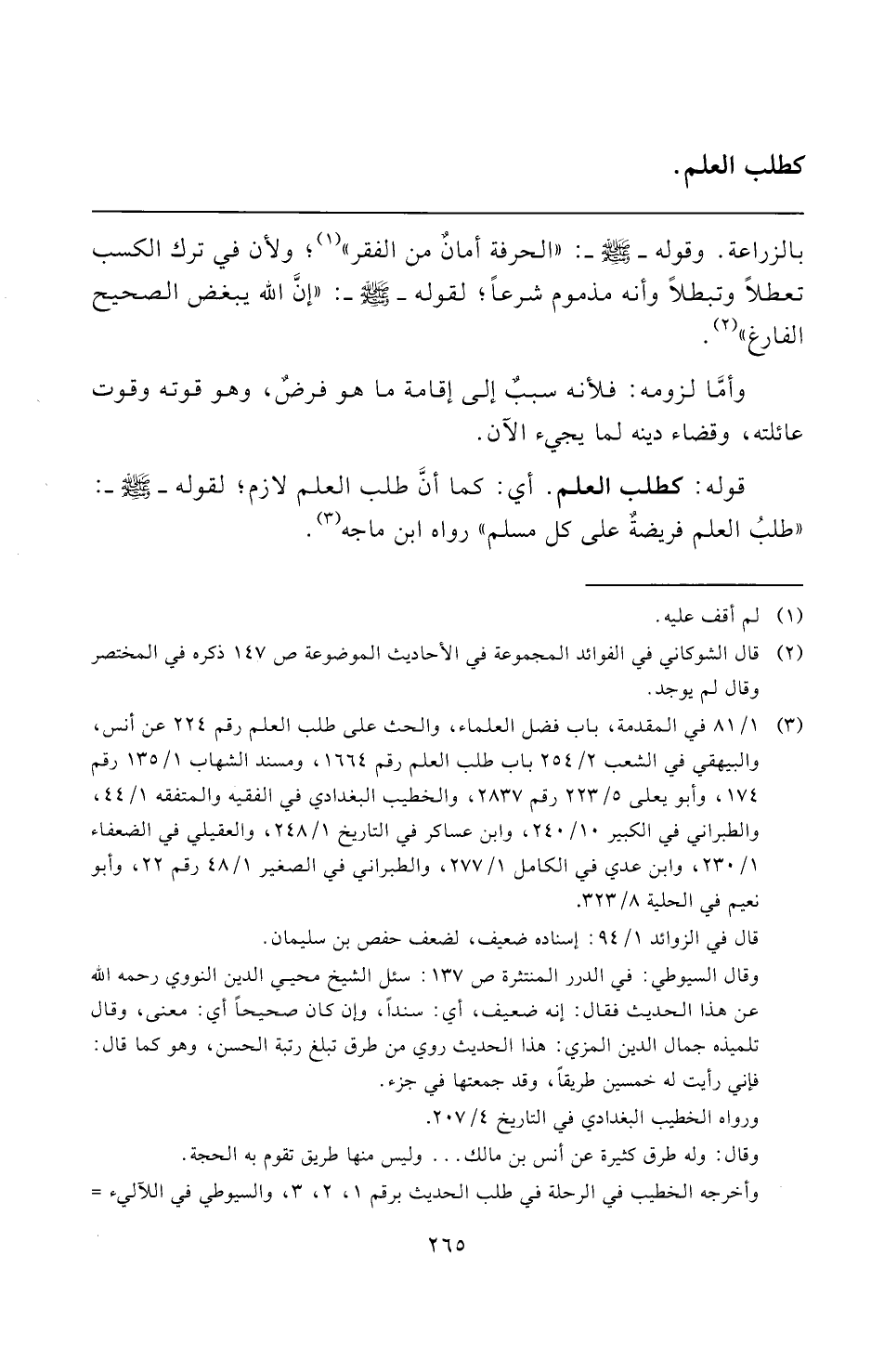 قوله: كطلب العلم. أي: كما أنَّ طلب العلم لازم؛ لقوله -صلى الله عليه وسلم-: "طلبُ العلم فريضةٌ على كل مسلم" رواه ابن ماجه (¬٣).