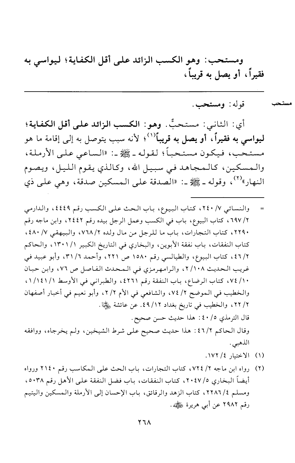أي: الثاني: مستحبٌّ. وهو: الكسب الزائد على أقل الكفاية؛ ليواسي به فقيرًا، أو يصل به قريبًا (¬١)؛ لأنه سبب يتوصل به إلى إقامة ما هو مستحب، فيكون مستحبًا؛ لقوله -صلى الله عليه وسلم-: "الساعي على الأرملة، والمسكين، كالمجاهد في سبيل الله، وكالذي يقوم الليل، ويصوم النهار" (¬٢)، وقوله -صلى الله عليه وسلم-: "الصدقة على المسكين صدقة، وهي على ذي