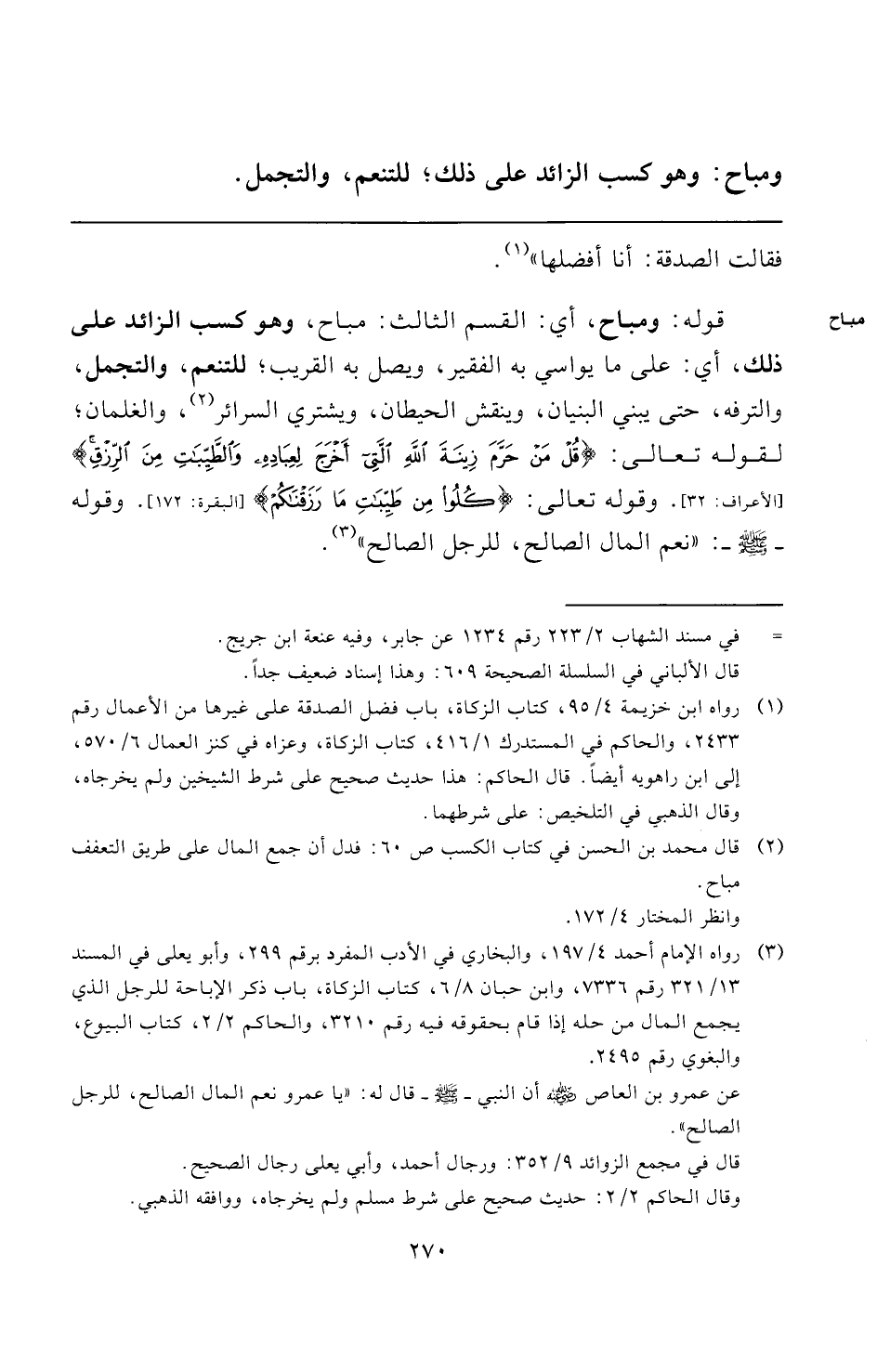 قوله: ومباح، أي: القسم الثالث: مباح، وهو كسب الزائد على ذلك، أي: على ما يواسي به الفقير، ويصل به القريب؛ للتنعم، والتجمل، والترفه، حتى يبني البنيان، وينقش الحيطان، ويشتري السرائر (¬٢)، والغلمان؛ لقوله تعالى: {قُلْ مَنْ حَرَّمَ زِينَةَ اللَّهِ الَّتِي أَخْرَجَ لِعِبَادِهِ وَالطَّيِّبَاتِ مِنَ الرِّزْقِ} [الأعراف: ٣٢]. وقوله تعالى: {كُلُوا مِنْ طَيِّبَاتِ مَا رَزَقْنَاكُمْ} [البقرة: ١٧٢]. وقوله -صلى الله عليه وسلم-: "نعم المال الصالح، للرجل الصالح" (¬٣).