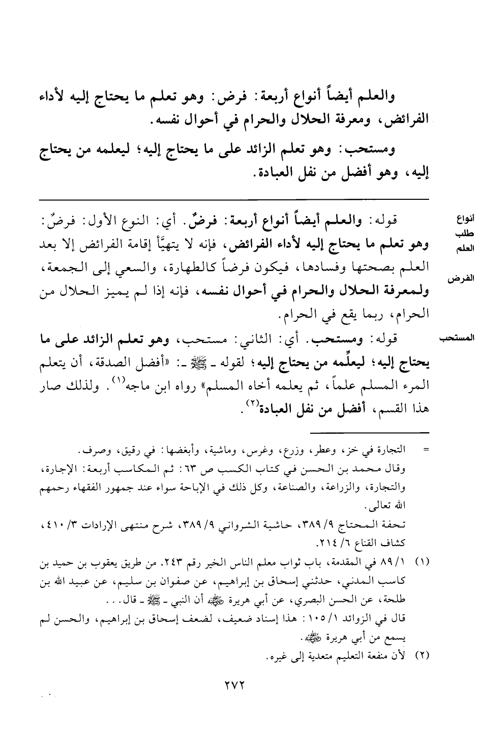 والعلم أيضًا أنواع أربعة: فرض: وهو تعلم ما يحتاج إليه لأداء الفرائض، ومعرفة الحلال والحرام في أحوال نفسه.