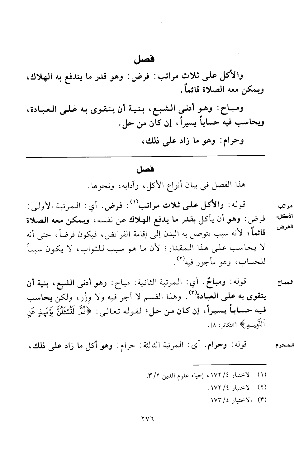 والأكل على ثلاث مراتب: فرض: وهو قدر ما يندفع به الهلاك، ويمكن معه الصلاة قائمًا.