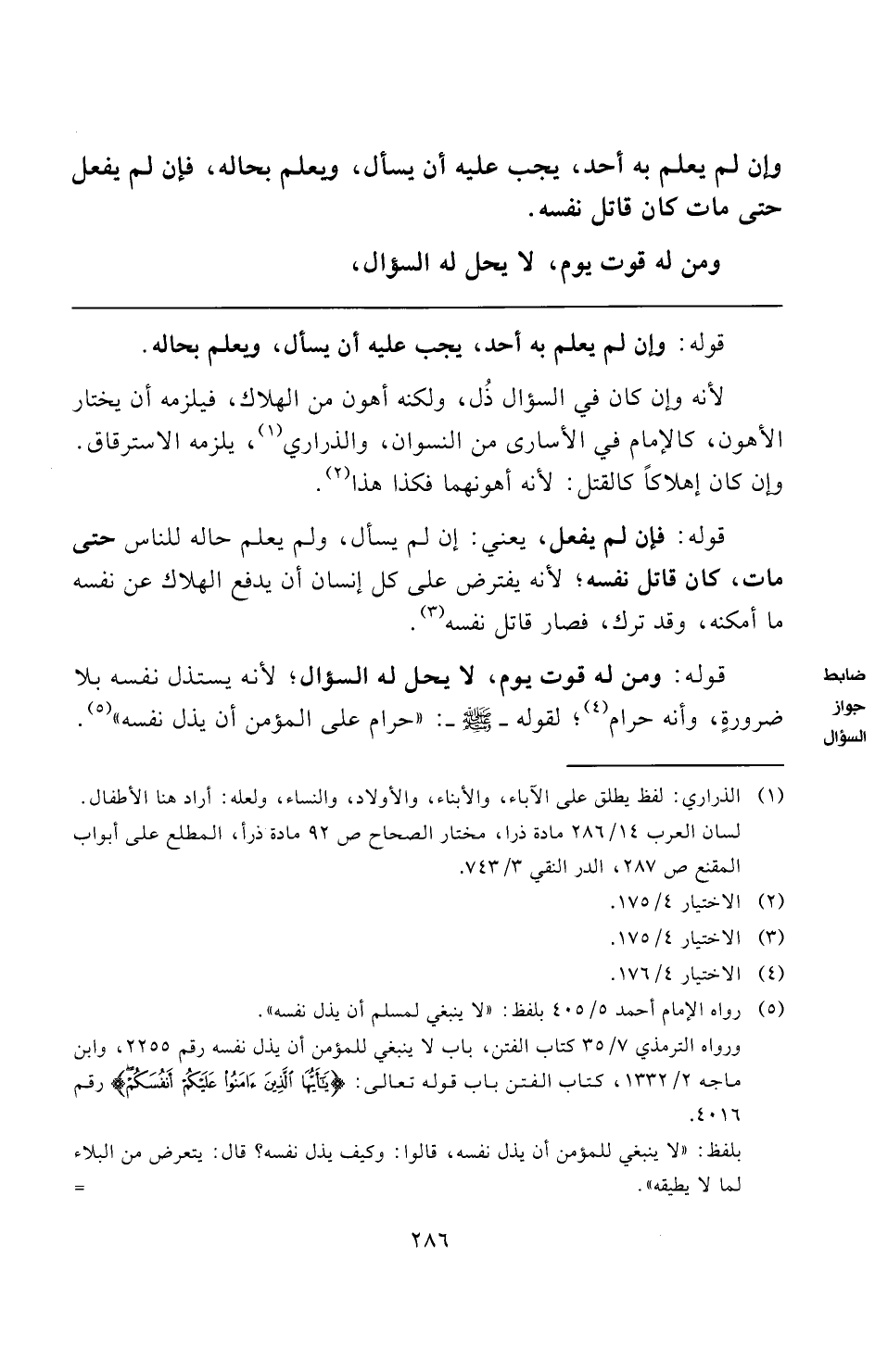 قوله: ومن له قوت يوم، لا يحل له السوال؛ لأنه يستذل نفسه بلا ضرورةٍ، وأنه حرام (¬٤)؛ لقوله -صلى الله عليه وسلم-: "حرام على المؤمن أن يذل نفسه" (¬٥).