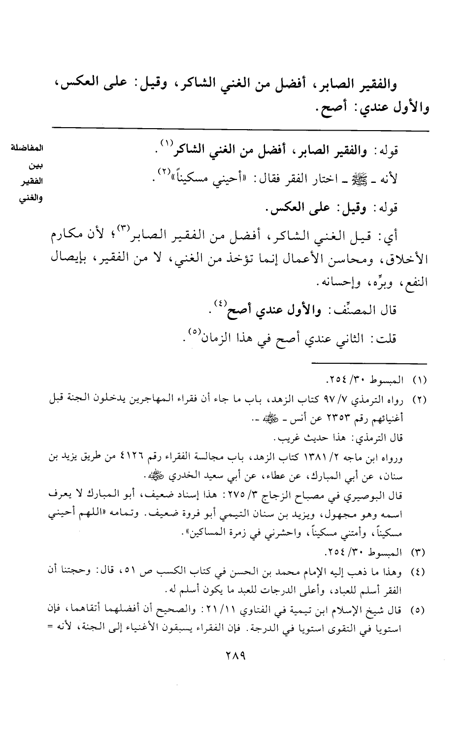 (¬٤) وهذا ما ذهب إليه الإمام محمد بن الحسن في كتاب الكسب ص ٥١، قال: وحجتنا أن الفقر أسلم للعباد، وأعلى الدرجات للعبد ما يكون أسلم له.