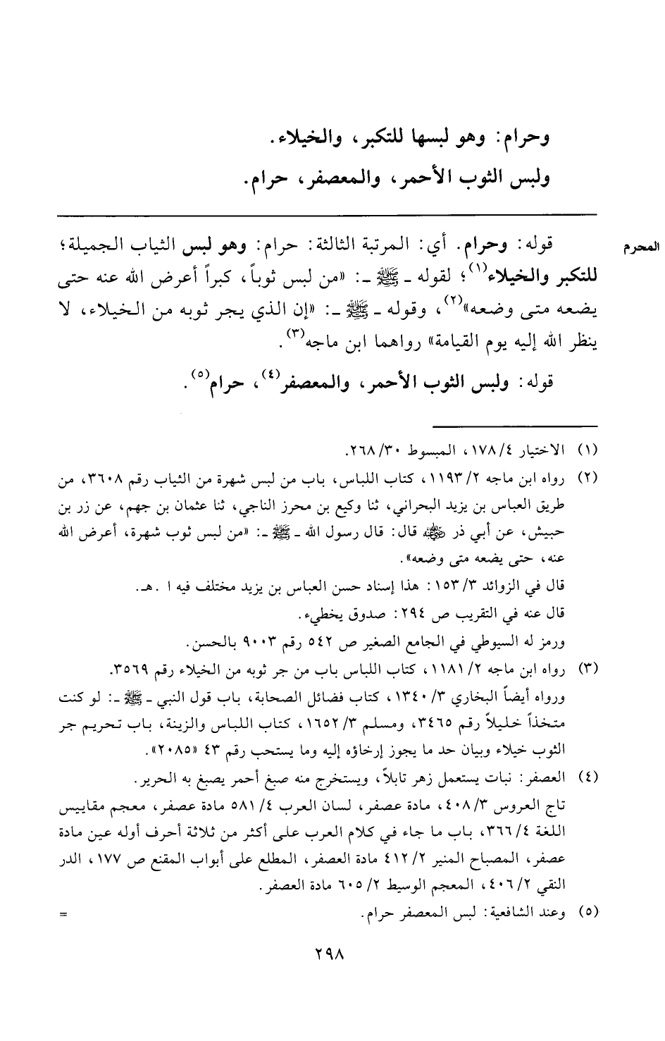 قوله: وحرام. أي: المرتبة الثالثة: حرام: وهو لبس الثياب الجميلة؛ للتكبر والخيلاء (¬١)؛ لقوله -صلى الله عليه وسلم-: "من لبس ثوبًا، كبرًا أعرض الله عنه حتى يضعه متى وضعه" (¬٢)، وقوله -صلى الله عليه وسلم-: "إن الذي يجر ثوبه من الخيلاء، لا ينظر الله إليه يوم القيامة" رواهما ابن ماجه (¬٣).
