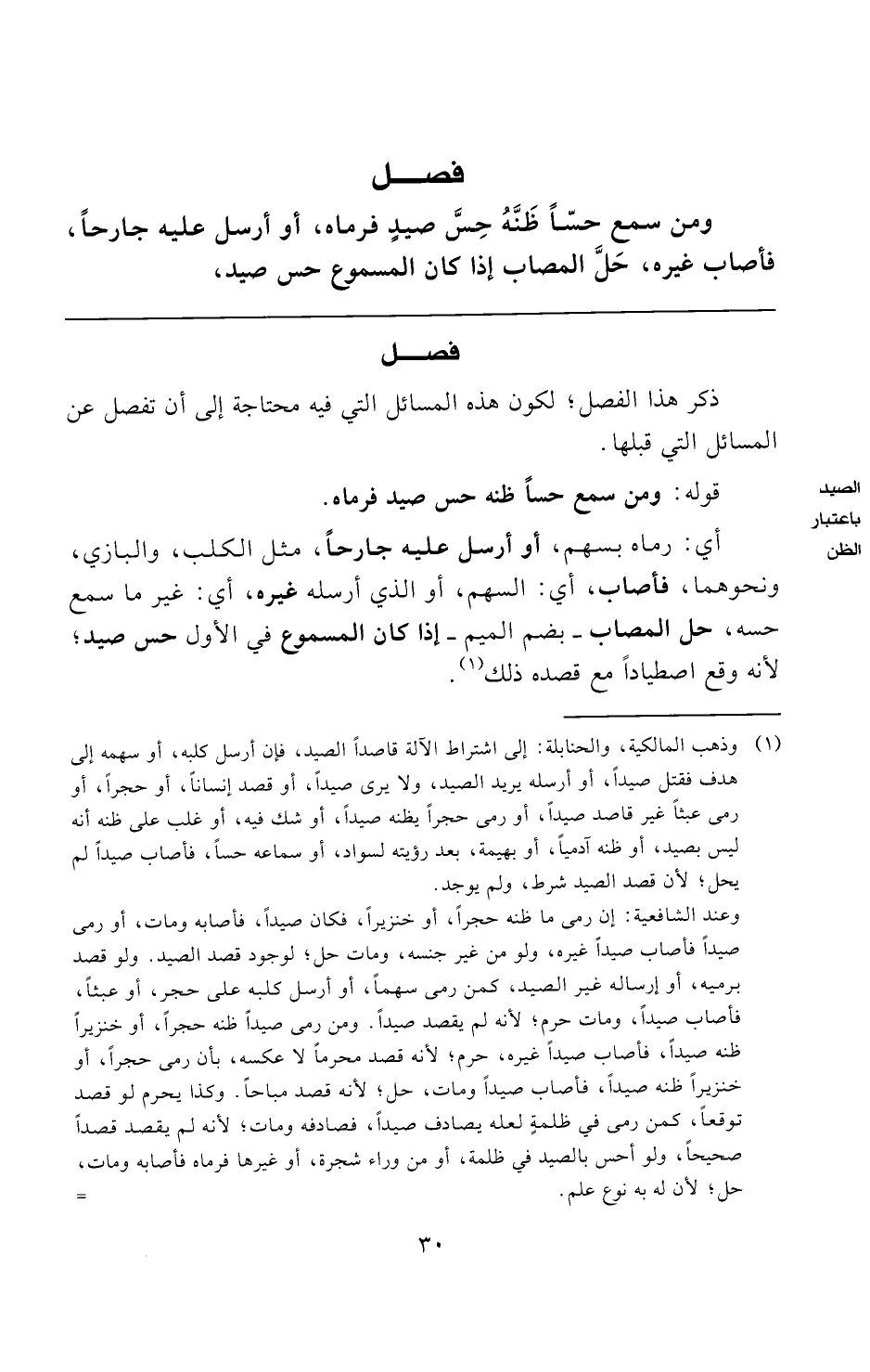 (¬١) وذهب المالكية، والحنابلة: إلى اشتراط الآلة قاصدًا الصيد، فإن أرسل كلبه، أو سهمه إلى هدف فقتل صيدًا، أو أرسله يريد الصيد، ولا يرى صيدًا، أو قصد إنسانًا، أو حجرًا، أو رمى عبثًا غير قاصد صيدًا، أو رمى حجرًا يظنه صيدًا، أو شك فيه، أو غلب على ظنه أنه ليس بصيد، أو ظنه آدميًا، أو بهيمة، بعد رؤيته لسواد، أو سماعه حسًا، فأصاب صيدًا لم يحل؛ لأن قصد الصيد شرط، ولم يوجد.