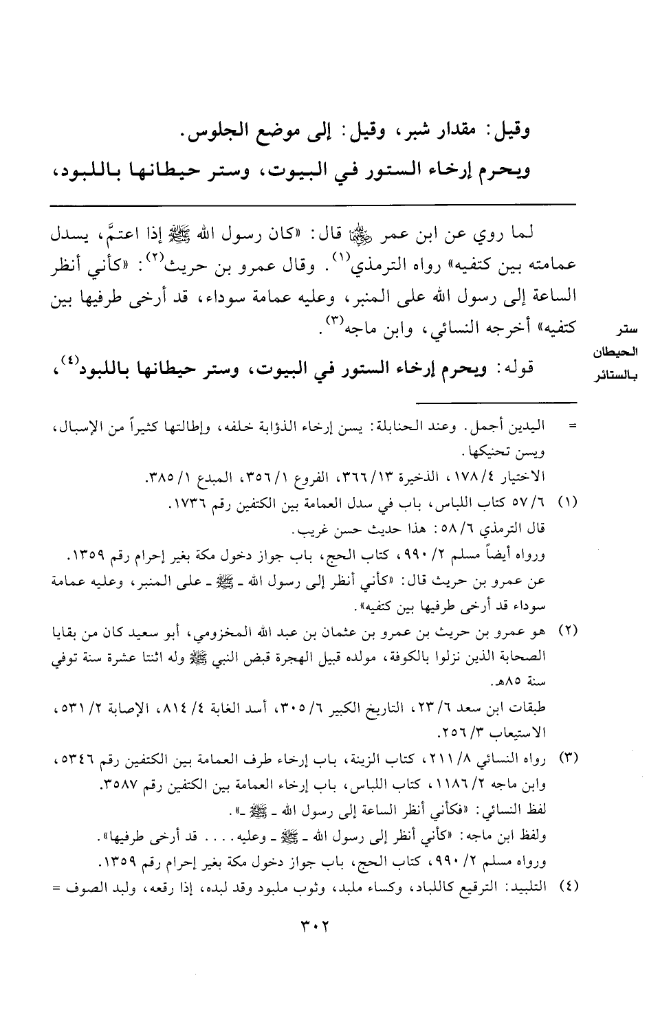 (¬١) ٦/ ٥٧ كتاب اللباس، باب في سدل العمامة بين الكتفين رقم ١٧٣٦.