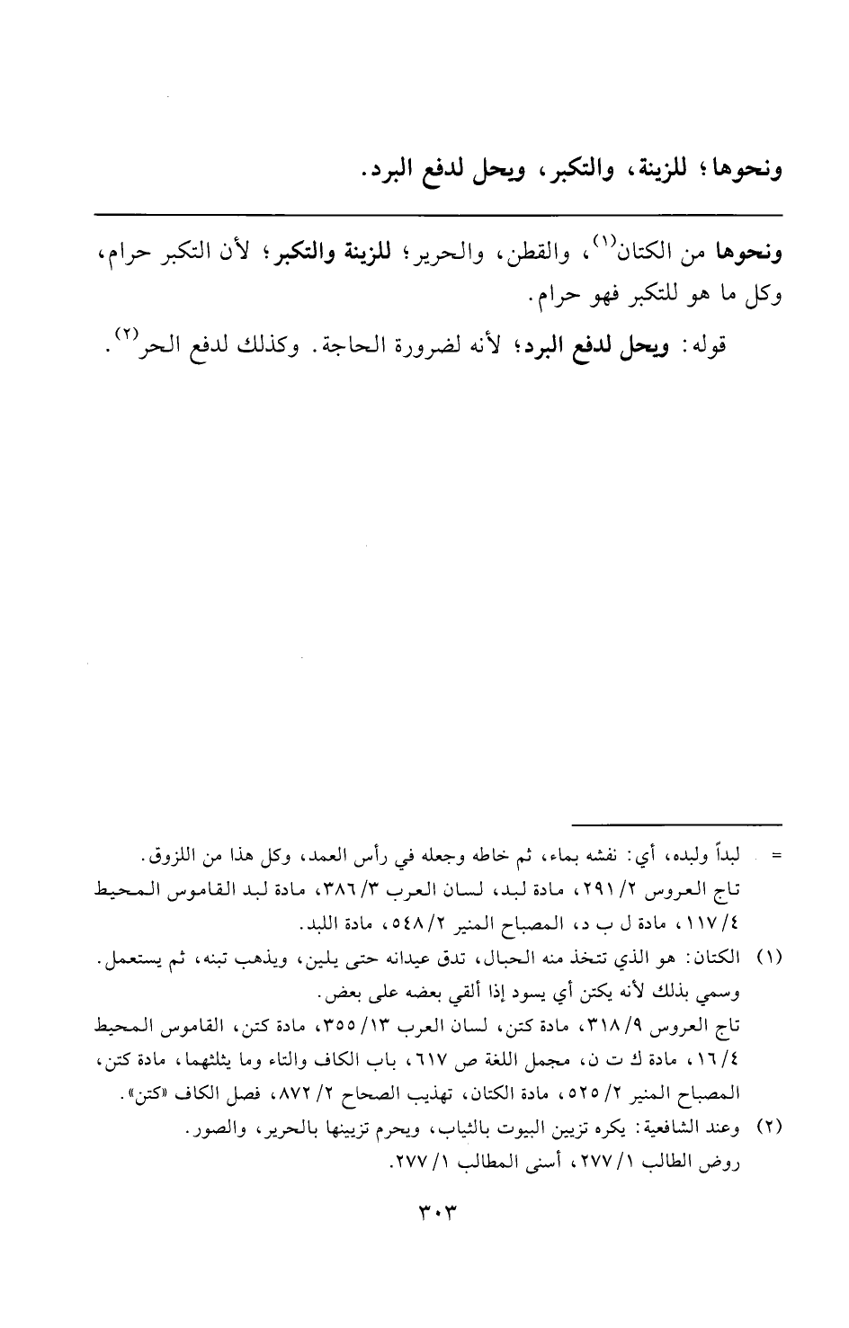 ونحوها من الكتان (¬١)، والقطن، والحرير؛ للزينة والتكبر؛ لأن التكبر حرام، وكل ما هو للتكبر فهو حرام.