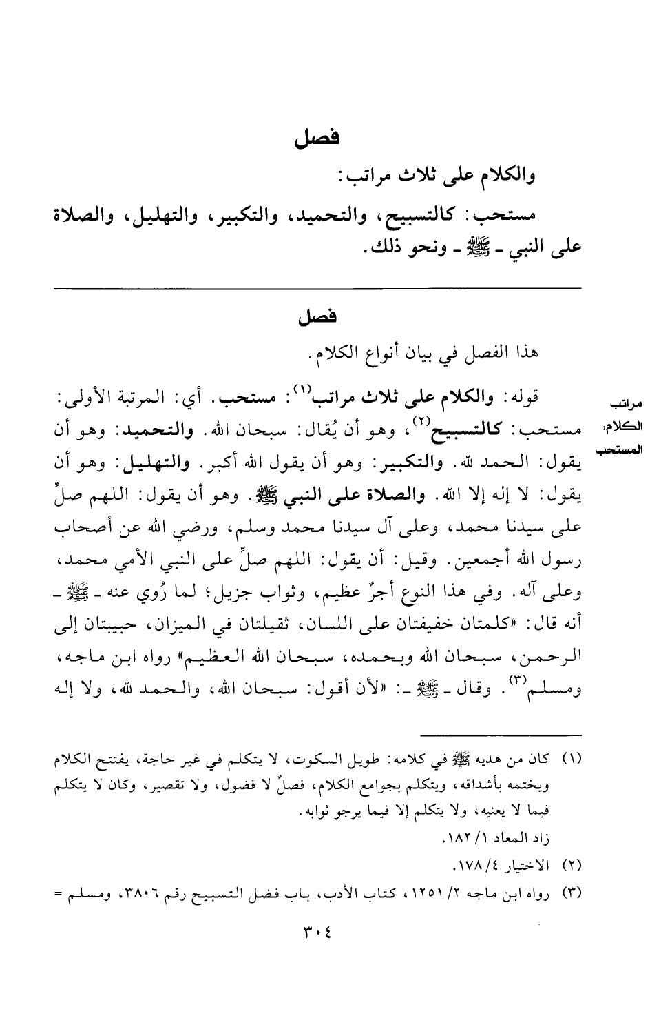 قوله: والكلام على ثلاث مراتب (¬١): مستحب. أي: المرتبة الأولى: مستحب: كالتسبيح (¬٢)، وهو أن يُقال: سبحان الله. والتحميد: وهو أن يقول: الحمد لله. والتكبير: وهو أن يقول الله أكبر. والتهليل: وهو أن يقول: لا إله إلا الله. والصلاة على النبي -صلى الله عليه وسلم-. وهو أن يقول: اللهم صلِّ على سيدنا محمد، وعلى آل سيدنا محمد وسلم، ورضي الله عن أصحاب رسول الله أجمعين. وقيل: أن يقول: اللهم صلِّ على النبي الأمي محمد، وعلى آله. وفي هذا النوع أجرٌ عظيم، وثواب جزيل؛ لما رُوي عنه -صلى الله عليه وسلم- أنه قال: "كلمتان خفيفتان على اللسان، ثقيلتان في الميزان، حبيبتان إلى الرحمن، سبحان الله وبحمده، سبحان الله العظيم" رواه ابن ماجه، ومسلم (¬٣). وقال -صلى الله عليه وسلم-: "لأن أقول: سبحان الله، والحمد لله، ولا إله