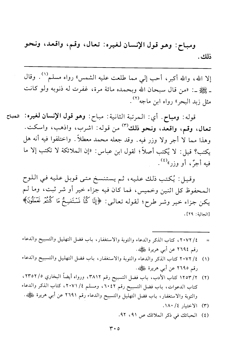 وهذا مما لا أجر ولا وزر فيه. وقد جعله محمد معطلًا. واختلفوا فيه أنه هل يكتب؟ قيل: لا يُكتب أصلًا؛ لقول ابن عباس: "إن الملائكة لا تكتب إلا ما فيه أجرٌ، أو وزر" (¬٤).