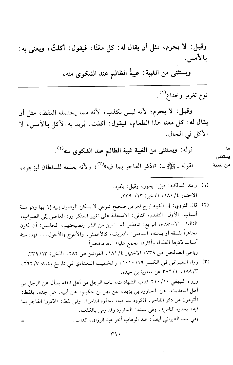 (¬٢) قال النووي: إن الغيبة تباح لغرض صحيح شرعي لا يمكن الوصول إليه إلا بها وهو ستة أسباب. الأول: التظلم، الثاني: الاستعانة على تغيير المنكر ورد العاصي إلى الصواب، الثالث: الاستفتاء، الرابع: تحذير المسلمين من الشر ونصيحتهم، الخامس: أن يكون مجاهرًا بفسقه أو بدعته، السادس: التعريف، كالأعمش، والأعرج والأحول ... فهذه ستة أسباب ذكرها العلماء وأكثرها مجمع عليه" ا. هـ مختصرًا.