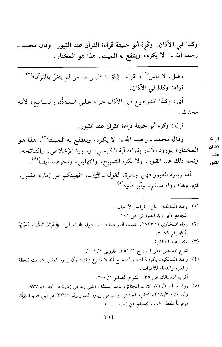 وكذا في الأذان. وكَرِهَ أبو حنيفة قراءة القرآن عند القبور. وقال محمد -رحمه الله-: لا يكره، وينتفع به الميت. هذا هو المختار.