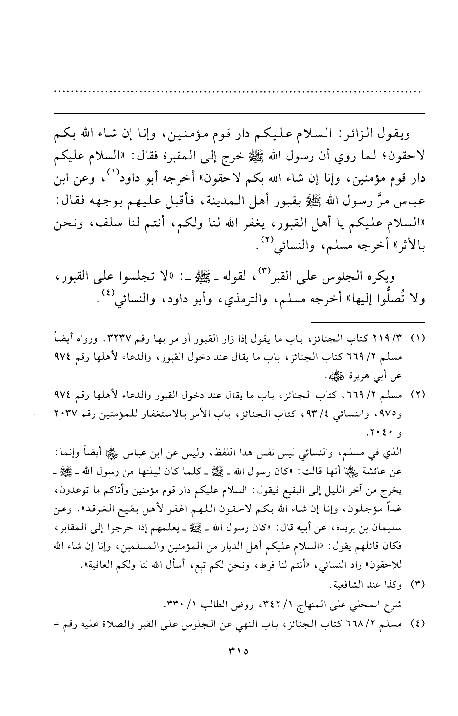 ويقول الزائر: السلام عليكم دار قوم مؤمنين، وإنا إن شاء الله بكم لاحقون؛ لما روي أن رسول الله -صلى الله عليه وسلم- خرج إلى المقبرة فقال: "السلام عليكم دار قوم مؤمنين، وإنا إن شاء الله بكم لاحقون" أخرجه أبو داود (¬١)، وعن ابن عباس مرَّ رسول الله -صلى الله عليه وسلم- بقبور أهل المدينة، فأقبل عليهم بوجهه فقال: "السلام عليكم يا أهل القبور، يغفر الله لنا ولكم، أنتم لنا سلف، ونحن بالأثر" أخرجه مسلم، والنسائي (¬٢).