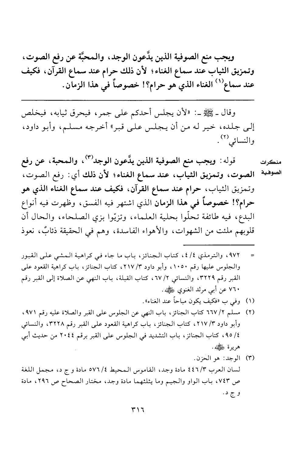 قوله: ويجب منع الصوفية الذين يدَّعون الوجد (¬٣)، والمحبة، عن رفع الصوت، وتمزيق الثياب، عند سماع الغناء؛ لأن ذلك أي: رفع الصوت، وتمزيق الثياب، حرام عند سماع القرآن، فكيف عند سماع الغناء الذي هو حرام؟! خصوصًا في هذا الزمان الذي اشتهر فيه الفسق، وظهرت فيه أنواع البدع، فيه طائفة تحلّوا بحلية العلماء، وتزيّوا بزي الصلحاء، والحال أن قلوبهم ملئت من الشهوات، والأهواء الفاسدة، وهم في الحقيقة ذئابٌ، نعوذ