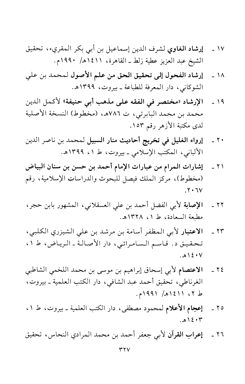 ٢٤ - الاعتصام لأبي إسحاق إبراهيم بن موسى بن محمد اللخمي الشاطبي الغرناطي، تحقيق أحمد عبد الشافي، دار الكتب العلمية - بيروت، ط ٢، ١٤١١ هـ / ١٩٩١ م.