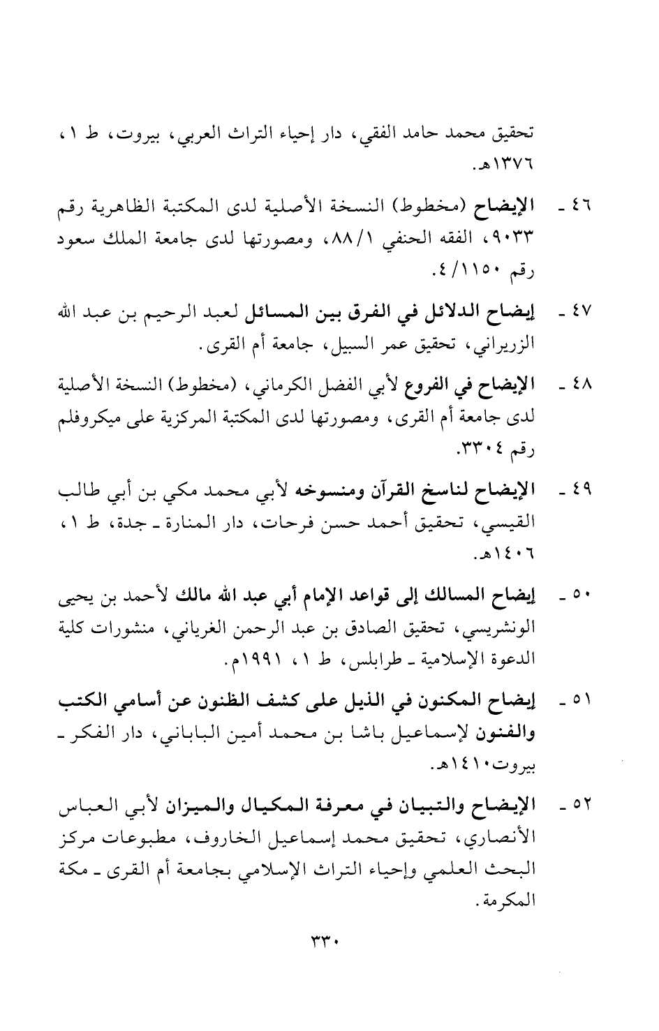 ٥٢ - الإيضاح والتبيان في معرفة المكيال والميزان لأبي العباس الأنصاري، تحقيق محمد إسماعيل الخاروف، مطبوعات مركز البحث العلمي وإحياء التراث الإسلامي بجامعة أم القرى - مكة المكرمة.