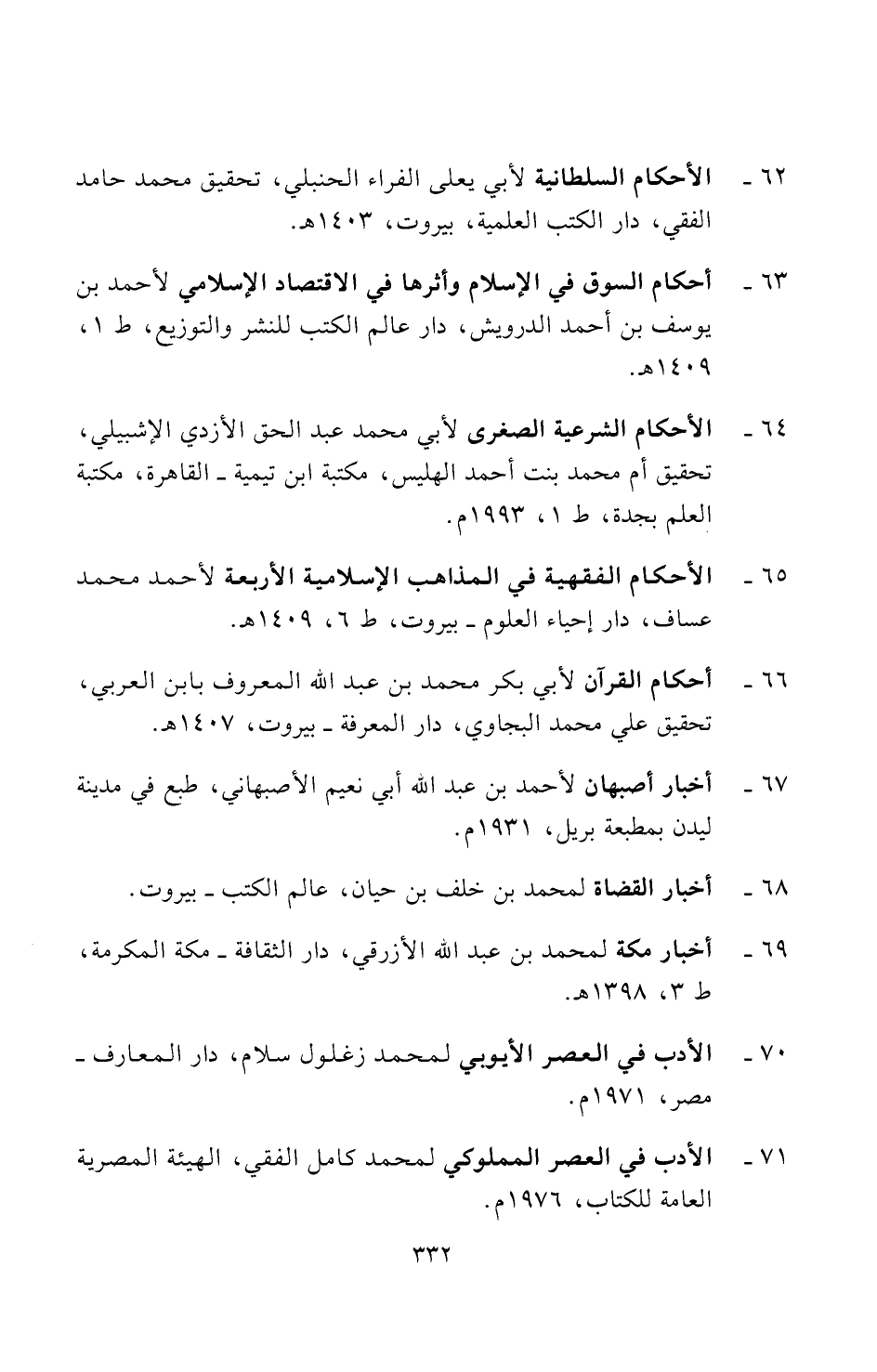 ٦٢ - الأحكام السلطانية لأبي يعلى الفراء الحنبلي، تحقيق محمد حامد الفقي، دار الكتب العلمية، بيروت، ١٤٠٣ هـ.