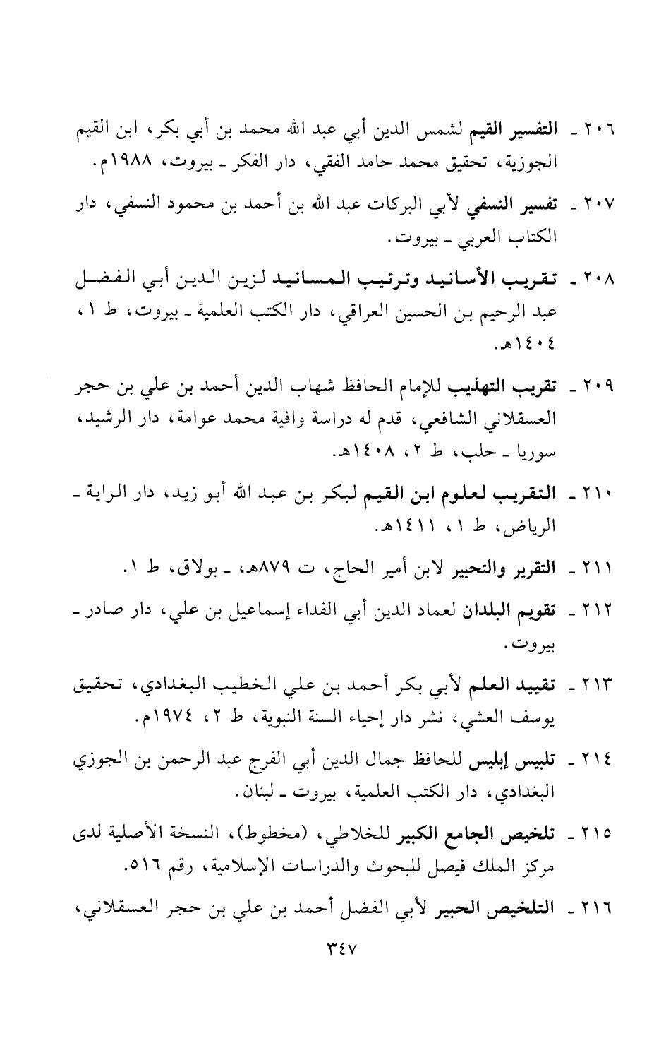 ٢٠٦ - التفسير القيم لشمس الدين أبي عبد الله محمد بن أبي بكر، ابن القيم الجوزية، تحقيق محمد حامد الفقي، دار الفكر - بيروت، ١٩٨٨ م.